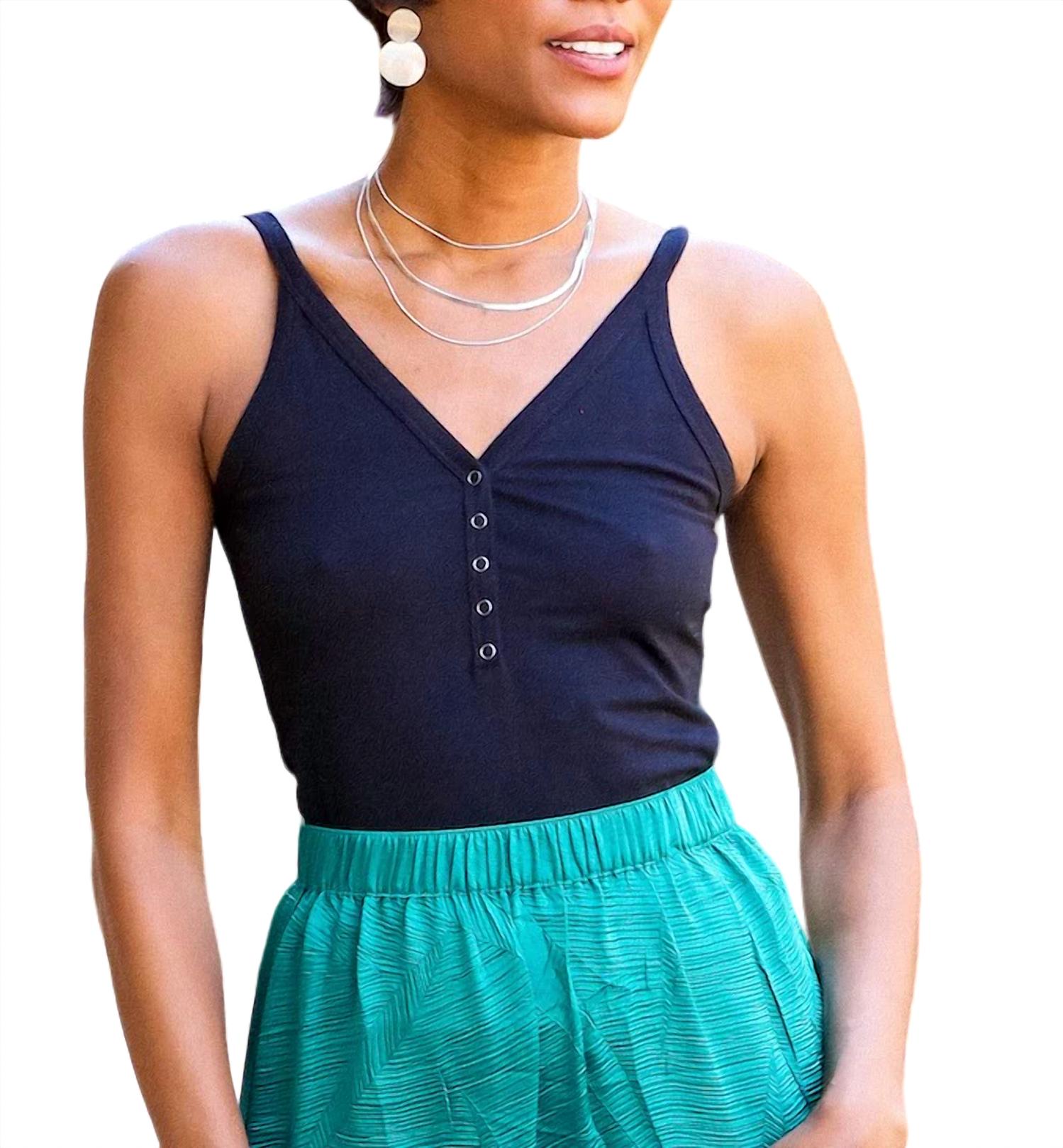 Lightweight bodysuit. Ribbed texture. 5 snap buttons down the front. Snap closure on bottom. Fabric: 95% cotton, 5% spandex. Model height: 5' 11". Wearing a size small.