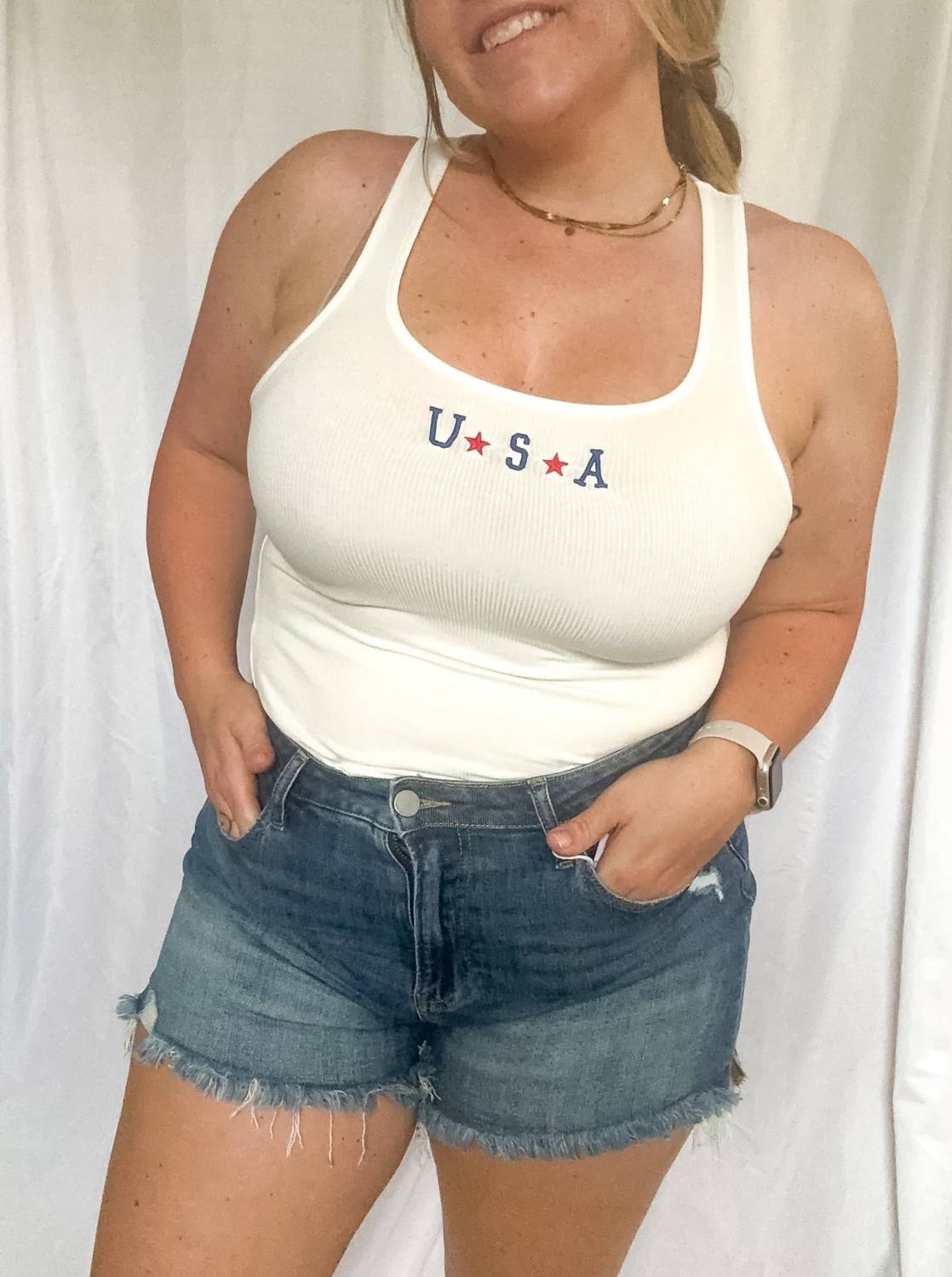 Pair this number with your favorite high-waisted jeans. Introducing the USA Embroidered Bodysuit by LE LIS, a perfect addition for summer festivities and patriotic celebrations. This women's tank bodysuit is crafted from a stretchy, non-sheer fabric and features a striking embroidered USA with star design. Composition: 92% Rayon, 8% Spandex. Care: Hand wash cold, color separate, do not bleach, lay flat to dry. Available in sizes from XS to LRG, running true to size.