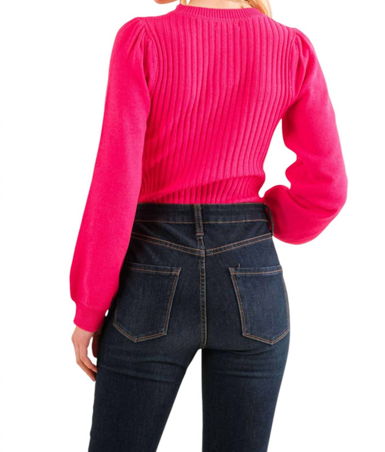 This cable-knit balloon sleeve bodysuit features a snap closure at the legs, long sleeves, a v-neck, and a button front. Made from 25% nylon and 75% acrylic.