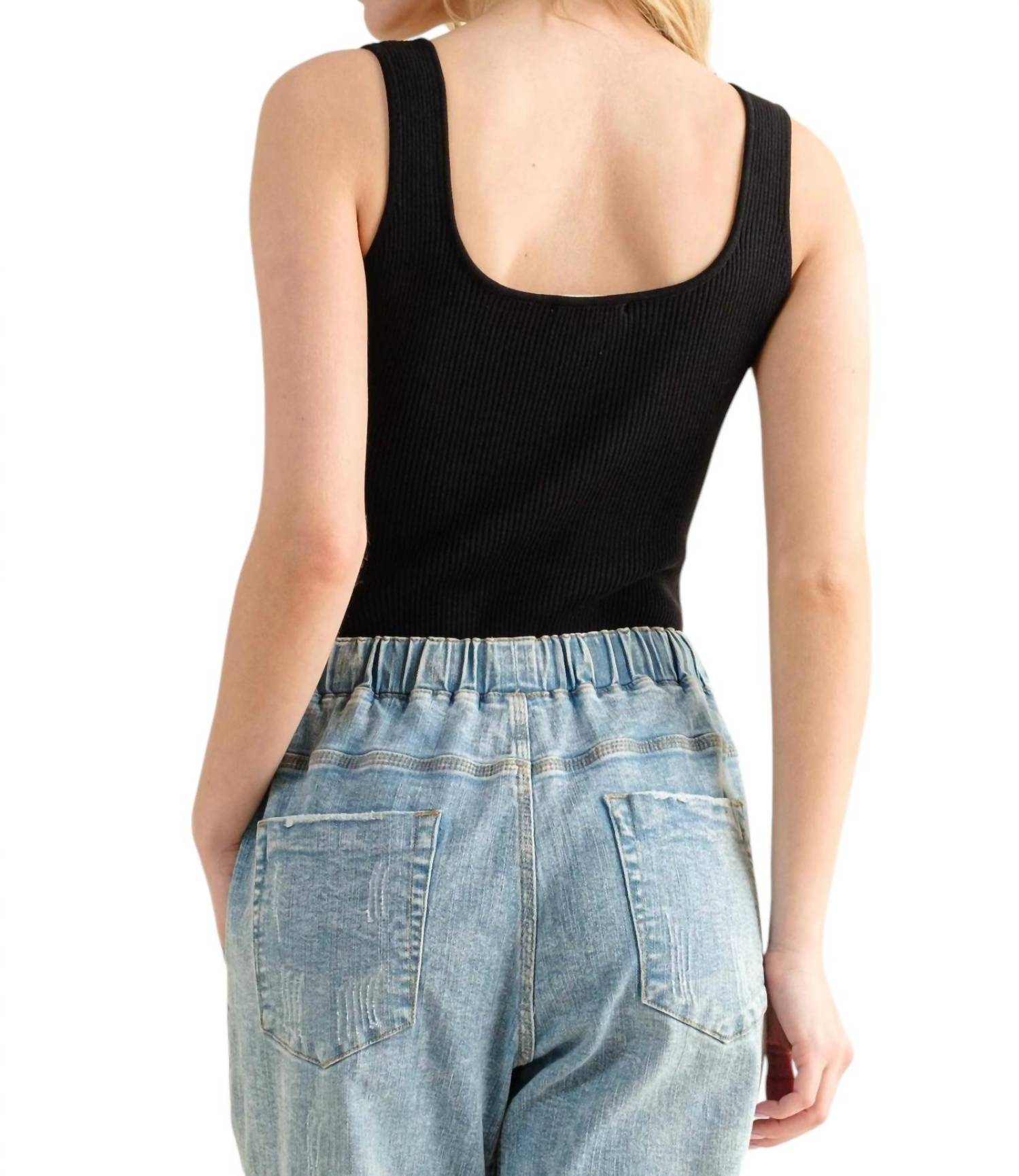 This ribbed tank bodysuit is crafted from a stretchy, ribbed fabric with a squared neckline and snap closure. It is sleeveless and made from 100% viscose.