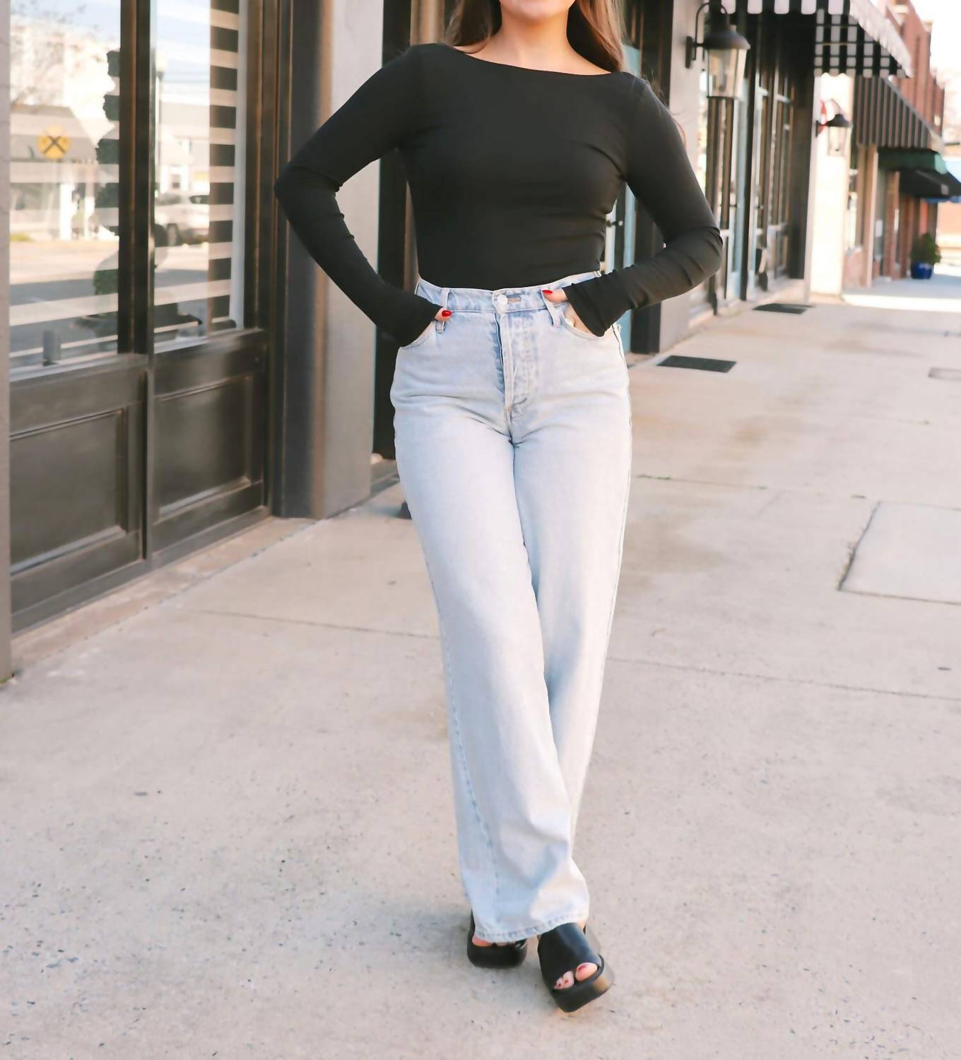Who doesn't love a good bodysuit? Introducing the Baela Bodysuit by Z Supply, a sleek addition to any wardrobe with its elegant long sleeves and classic crew neck. Made from Second Skin Baby Rib fabric, composed of 92% Rayon and 8% Spandex, it offers a figure-hugging fit with a daring low back design. The bodysuit features a functional snap button closure, providing thong coverage in a solid black color. Care for this minimalist piece is simple: machine wash cold on a gentle cycle and lay flat to dry. Model Maggie, who stands at 5’7”, typically opts for a size small in tops and has found the small to fit well.
