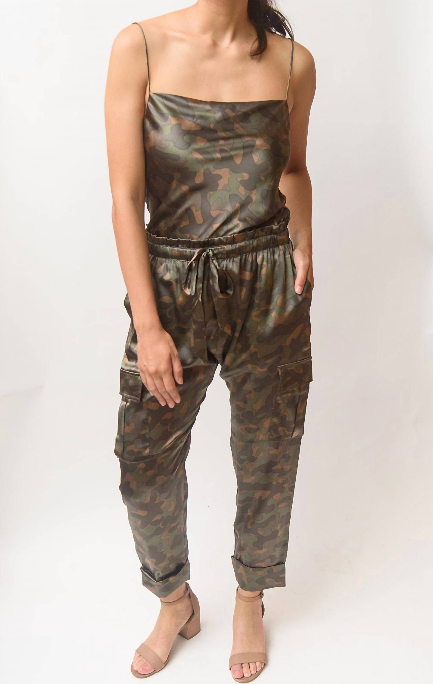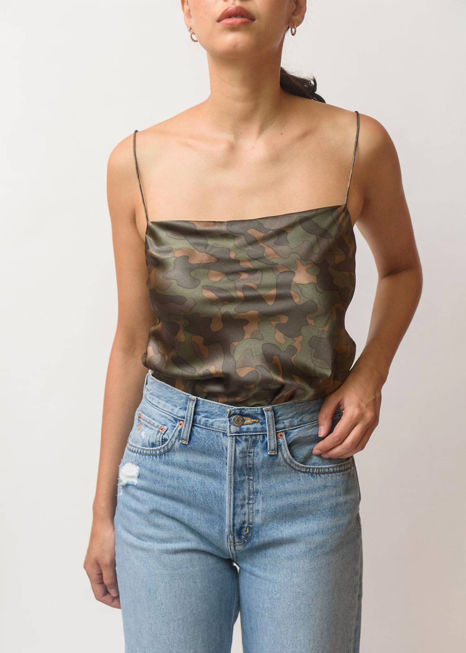 The Axel Bodysuit features a bias cut silhouette with delicate straps and a snap closure. The Axel is crafted from a stretch silk sandwash charmeuse featuring a cowl neckline for a sleek and effortless look. Fit: True To Size. Color: Camo.Fabric: 100% Silk. Care: Dry Clean