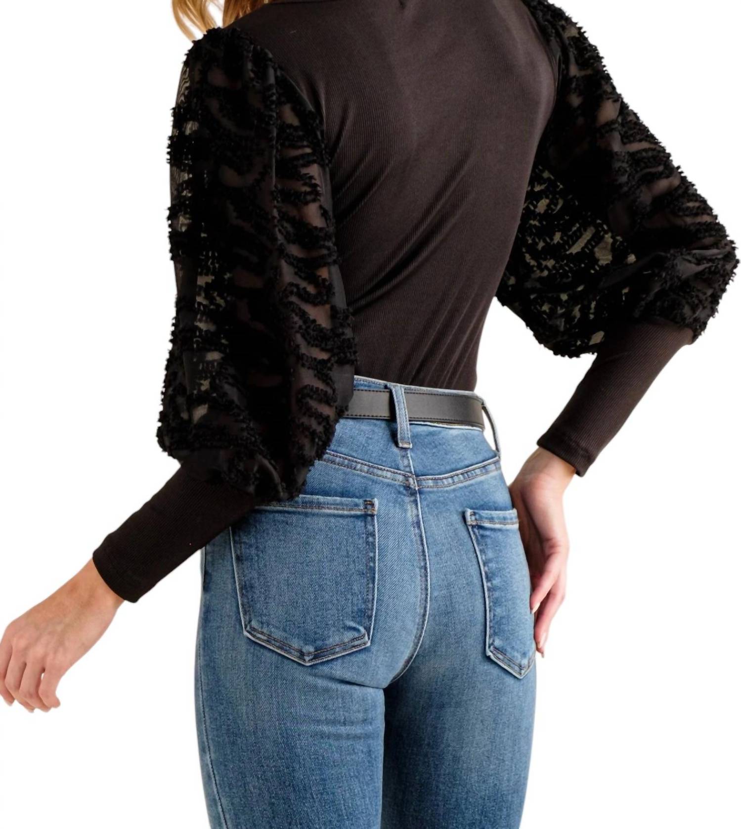 This fitted bodysuit features puff sleeves and a textured fabric, adding a touch of elegance to your wardrobe. Made from 96% Polyester and 4% Spandex for a comfortable stretch, with a 100% Polyester contrast.
