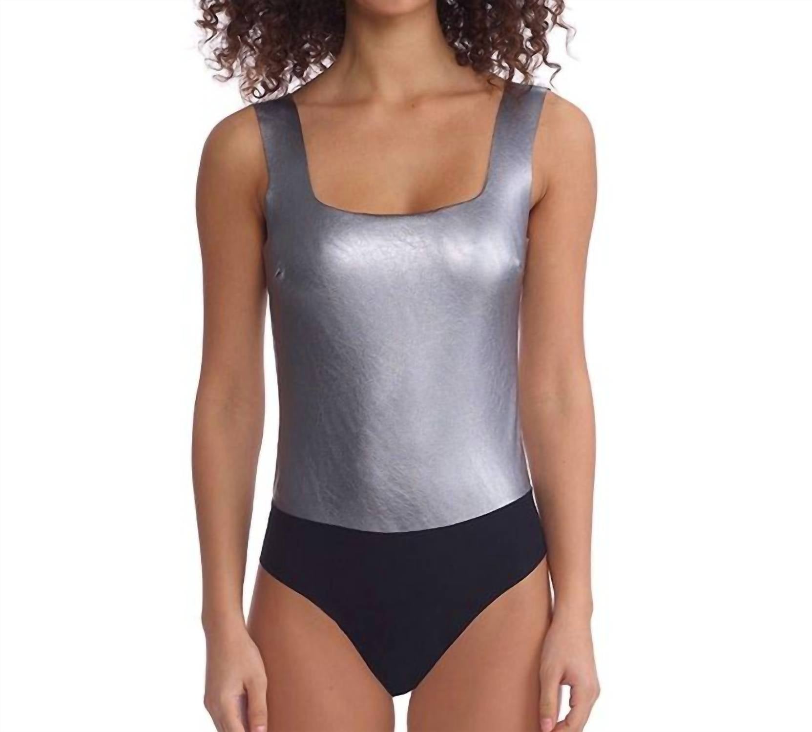 Form fitting and comfortable - this bodysuit check all of the boxes. Introducing the Commando Faux Leather Squareneck Bodysuit, a chic and versatile addition to any wardrobe. Designed for women in a solid silver hue, this bodysuit features a striking squareneck and a sleeveless design that offers both elegance and comfort. Made from a premium faux leather blend, it boasts four-way stretch (55% polyurethane, 44% viscose, 1% elastane) and a raw-cut thong bottom, ensuring a flattering fit that adjusts through wear. With its pull-on closure, this bodysuit promises ease of wear and a sleek silhouette, perfect for any occasion.