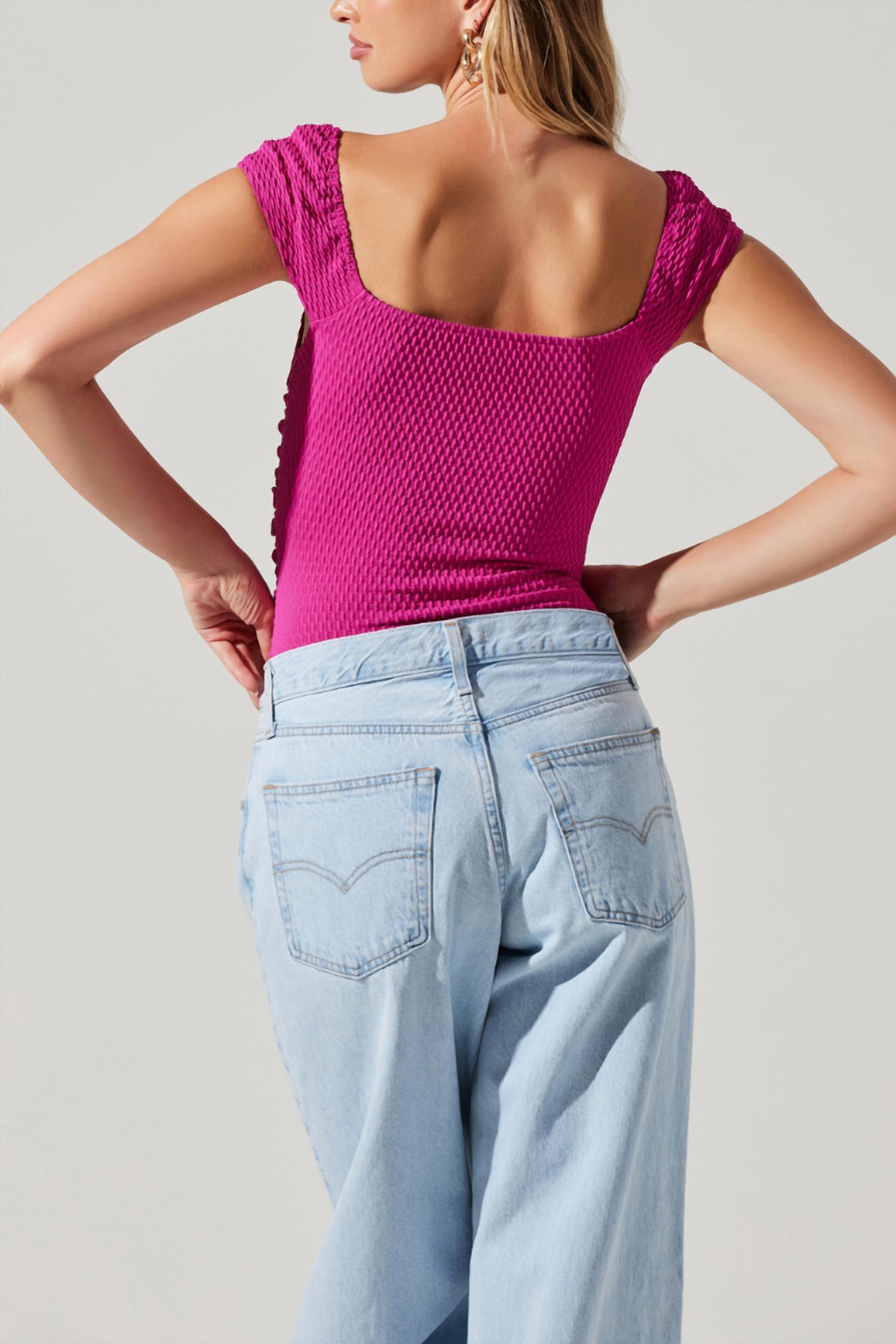 Who doesn't love a good bodysuit? Introducing the ASTR Ninette Plunging Bodysuit, a women’s piece that radiates confidence in vibrant magenta. With cap sleeves and a sweetheart neckline, this bodysuit features a wire structure at the bust for optimal support and comfort. Ideal for any vacation or summer outing, the textured fabric adds a playful charm. This trend-setting bodysuit coordinates beautifully with high-waisted denim for an effortlessly chic look.