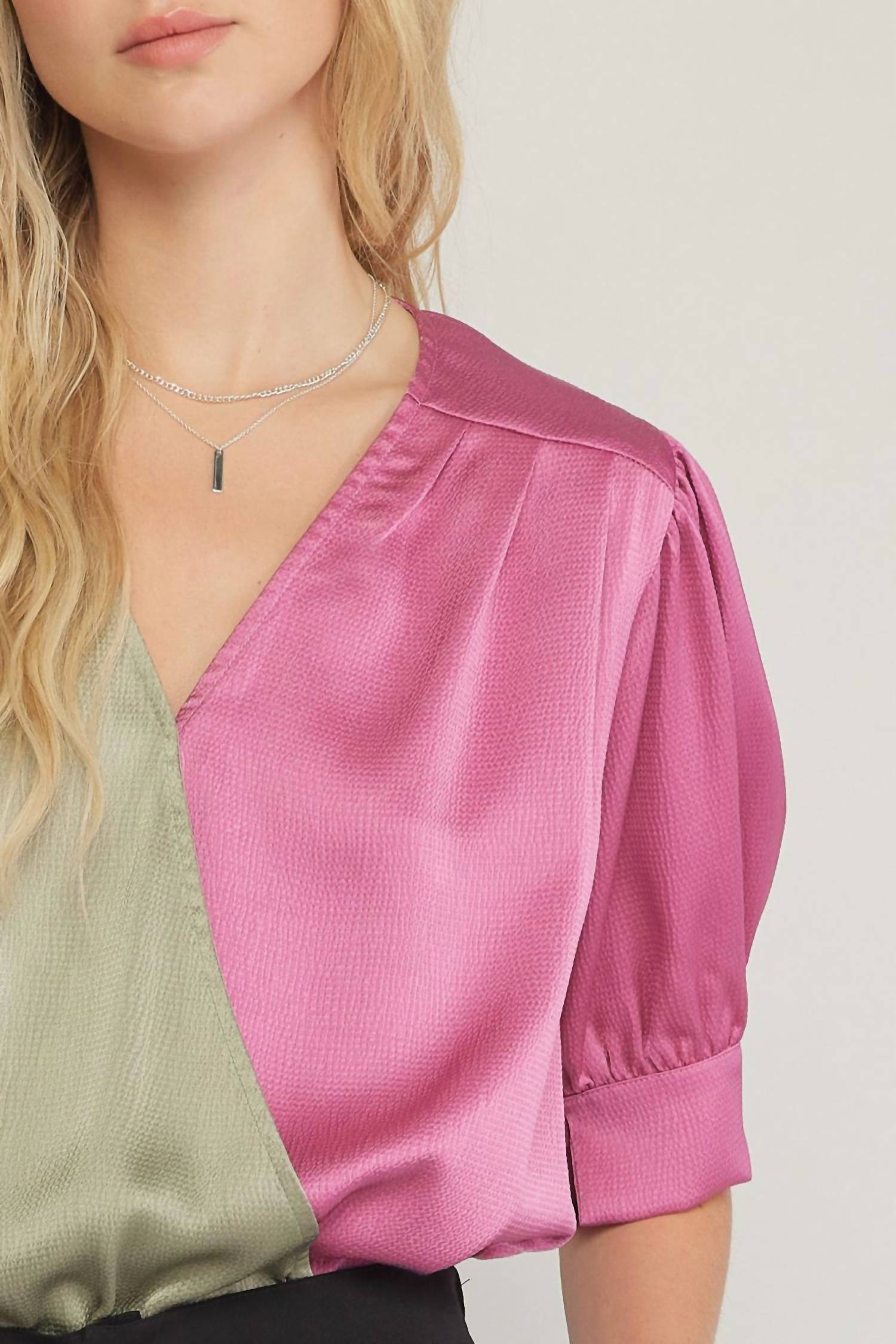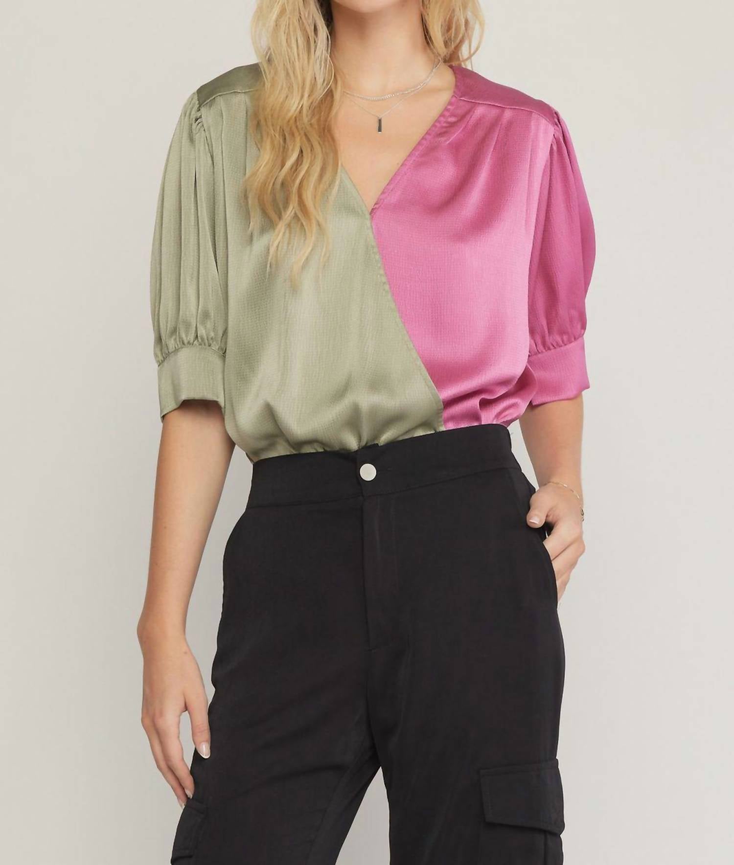Pair this number with your favorite high-waisted jeans. Introducing the Satin Colorblock Bodysuit by entro, an elegant choice for your next dinner party. Featuring elbow sleeves, this olive combo piece is crafted from 100% polyester satin, ensuring a lightweight feel. With its invisible button closure at the bust, snap button, and back keyhole button closures, it showcases pleat detailing for added sophistication. Care: Dry clean only.