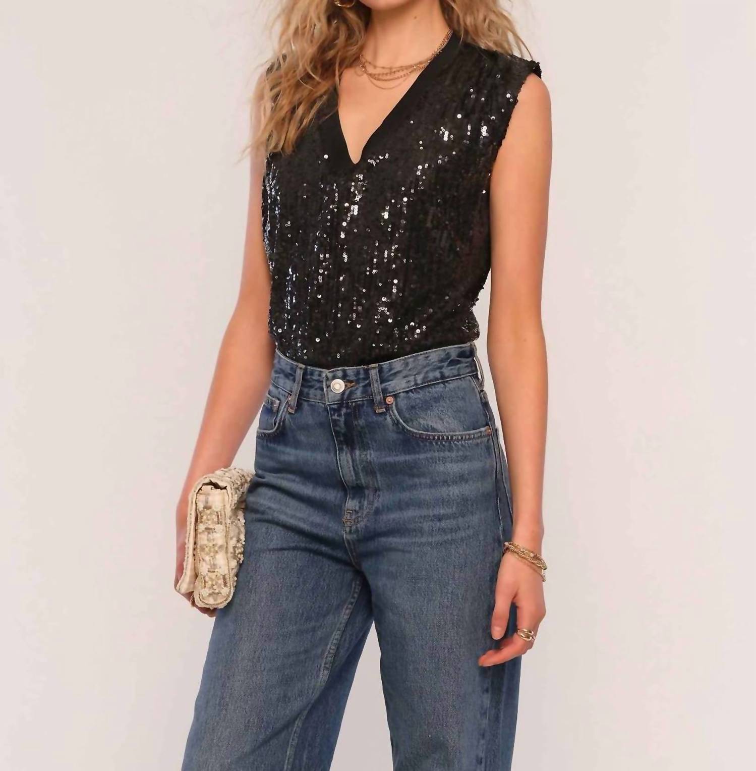 Pair this number with your favorite high-waisted jeans. Elevate your vacation wardrobe with the Farrah Soft Sequin Bodysuit by Heartloom, a stunning sleeveless piece crafted for celebration. This textured bodysuit in timeless black features a flattering V-neck, perfect for New Year's Eve festivities. Composition: 92% Polyester, 8% Spandex. Ideal for spring events and effortlessly chic, this women's bodysuit ensures you make a dazzling impression wherever you go.
