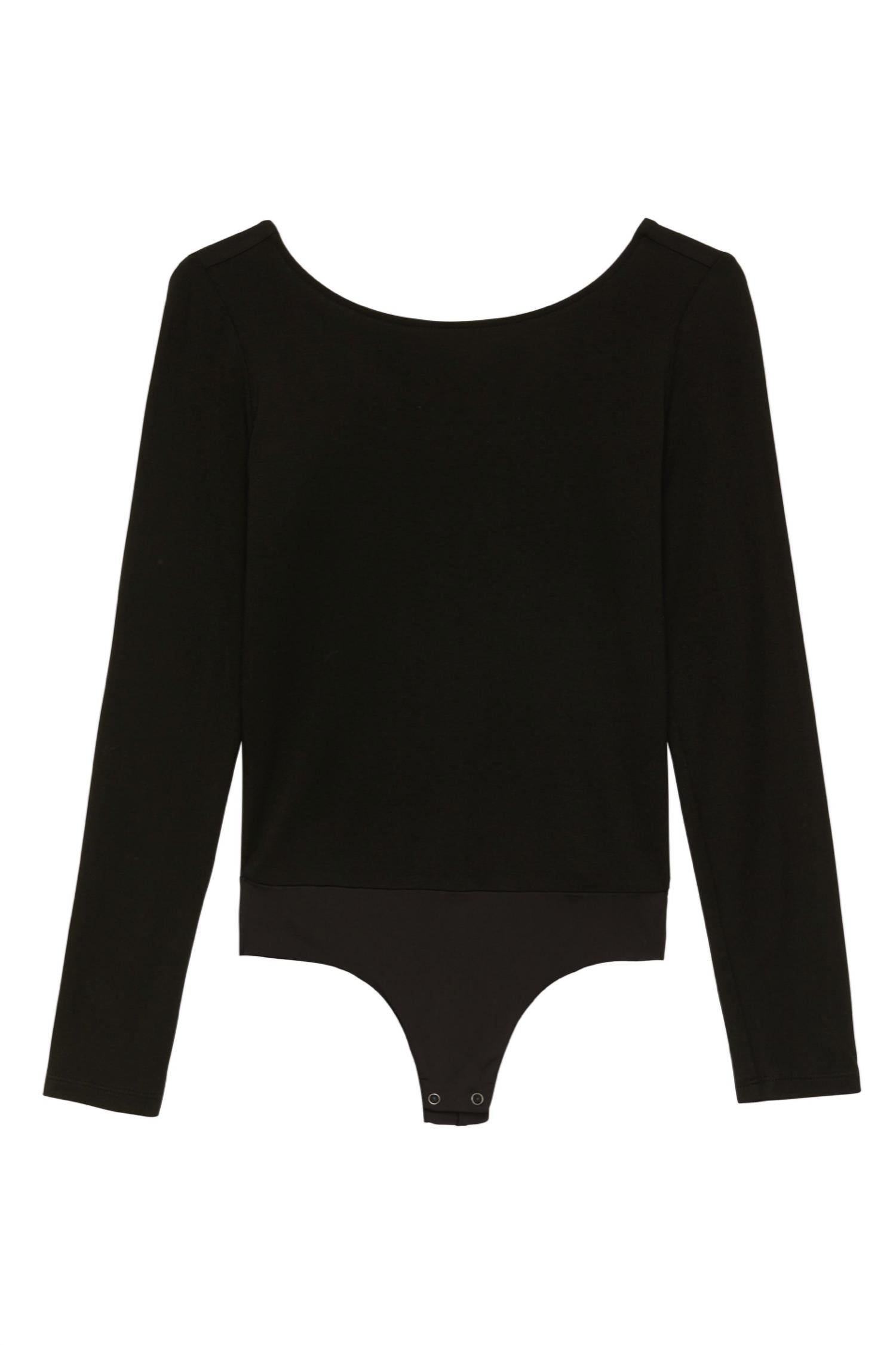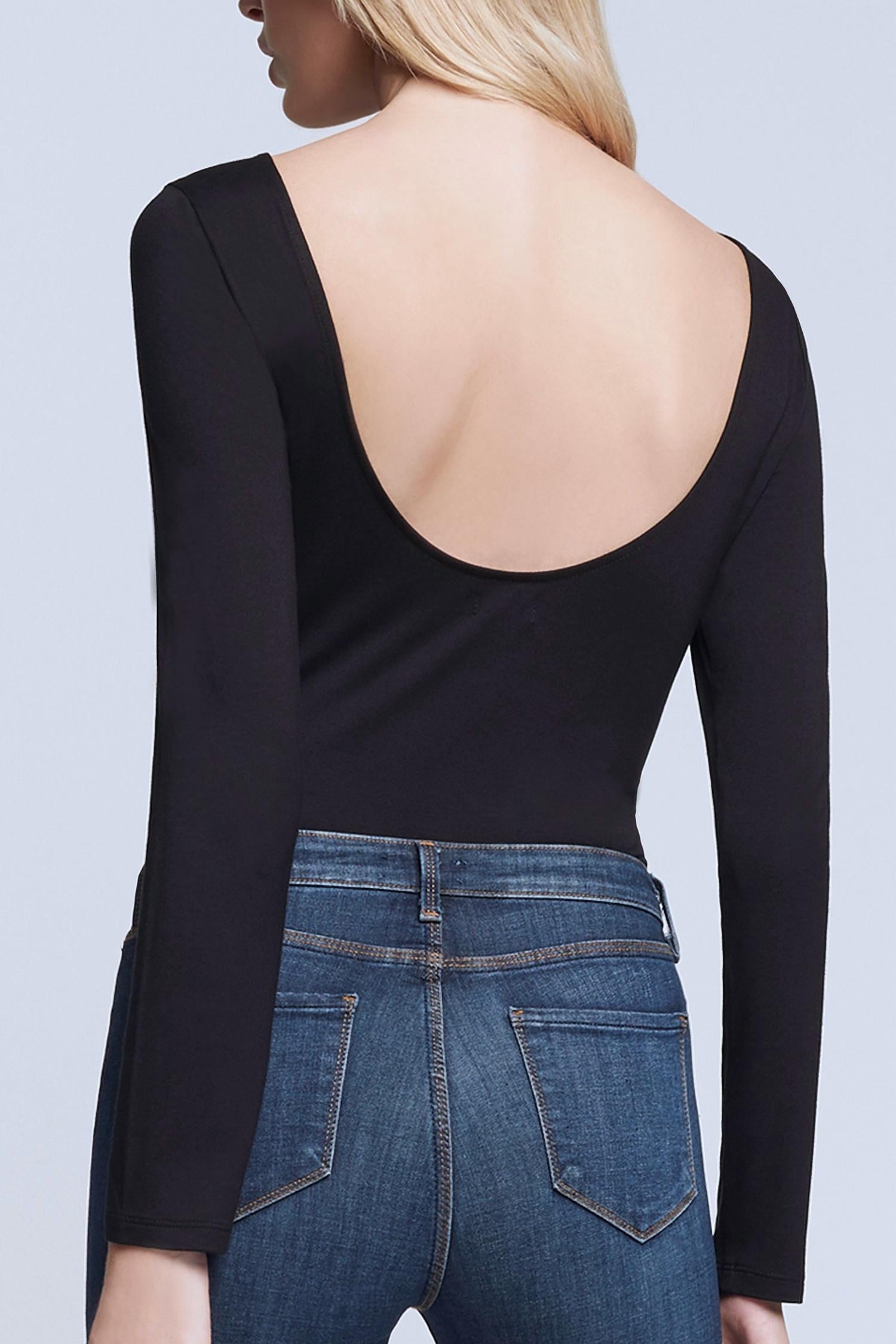 Form fitting and comfortable - this bodysuit check all of the boxes. Introducing the Angie Bodysuit by L'Agence, a chic addition to any wardrobe with its solid black, sleek scoop back design. Featuring slim long sleeves and crafted in a matte jersey with 93% Rayon and 7% Spandex, this bodysuit ensures a smooth, line-free look with a cheeky laser-cut panty and a convenient two-snap gusset. Closure is a simple pull-on style and it's made with meticulous attention to detail in an imported finish. Easy care with machine wash and line dry instructions make it perfect for effortless elegance on any occasion.
