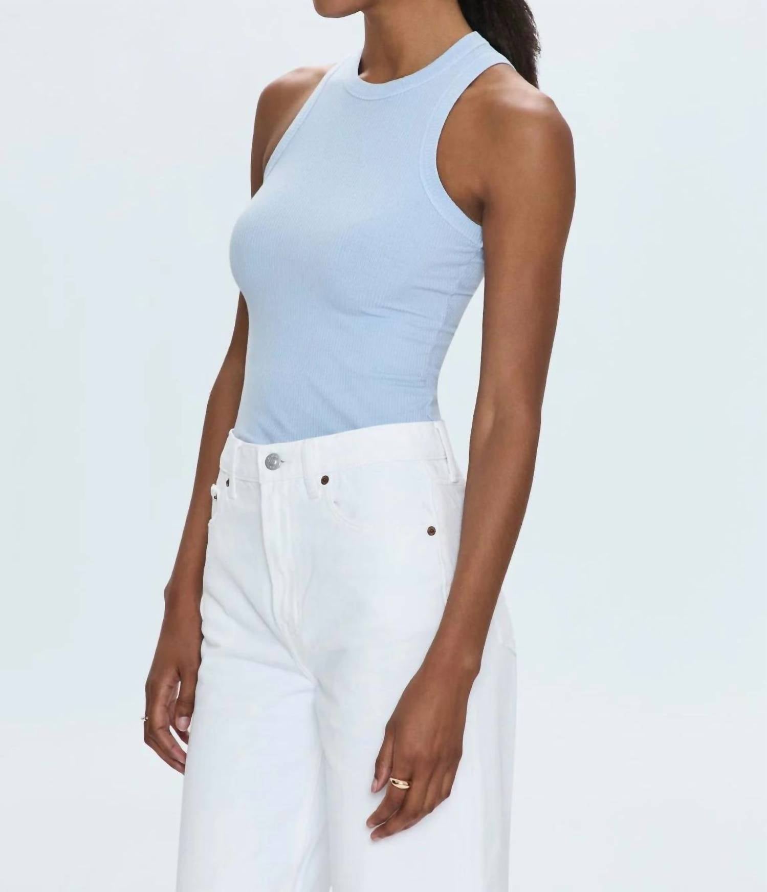 Form fitting and comfortable - this bodysuit check all of the boxes. Meet The Blake Bodysuit by PISTOLA, a minimalist essential that seamlessly blends comfort with style. This sleeveless design features a sleek solid pattern in celestial blue and a chic crewneck, perfect for your Thanksgiving holiday party. Crafted with polyurethane for a snug fit, it offers a convenient pull-on closure. Care for this stylish piece is simple—just machine wash for effortless maintenance.