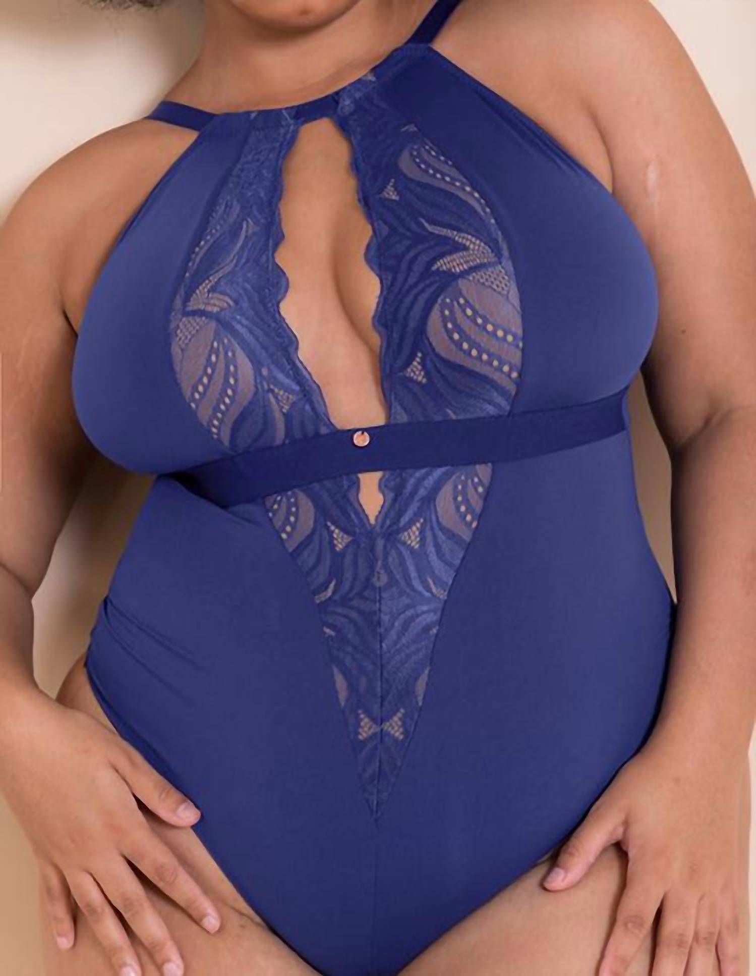 Who doesn't love a good bodysuit? Discover the elegant allure of the Indulgence Bodysuit by Scantilly, crafted for women in an enticing deep blue. This sleeveless piece features supportive stretch magnolia lace cups, a high neck halter shape, and a hook and eye closure for a secure fit. Made from a luxurious blend of 90% Polyamide, 10% Elastane for lace, 87% Polyester, 13% Elastane for the main body, and breathable mesh details. Hand wash this exquisite bodysuit with care to maintain its quiet luxury appeal. Designed with no pockets for a sleek silhouette, this bodysuit is perfect for special occasions like anniversaries or New Year's Eve.