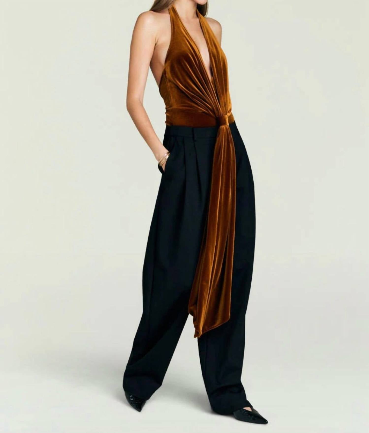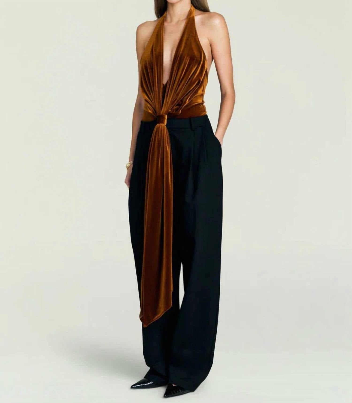 Who doesn't love a good bodysuit? Elevate your evening wardrobe with the SEROYA Vika Velvet Bodysuit, a testament to refined sensuality in rich Marigold. This halter-style piece is sleeveless and crafted from a plush blend of 95% polyester and 5% spandex, ensuring a luxurious feel and fit. The design features a button closure at the neck, highlighting its open back and plunging neckline for a stunning silhouette. Ideal for statement-making moments, this exquisite bodysuit promises elegance and personalized styling with its extended front tie detail.