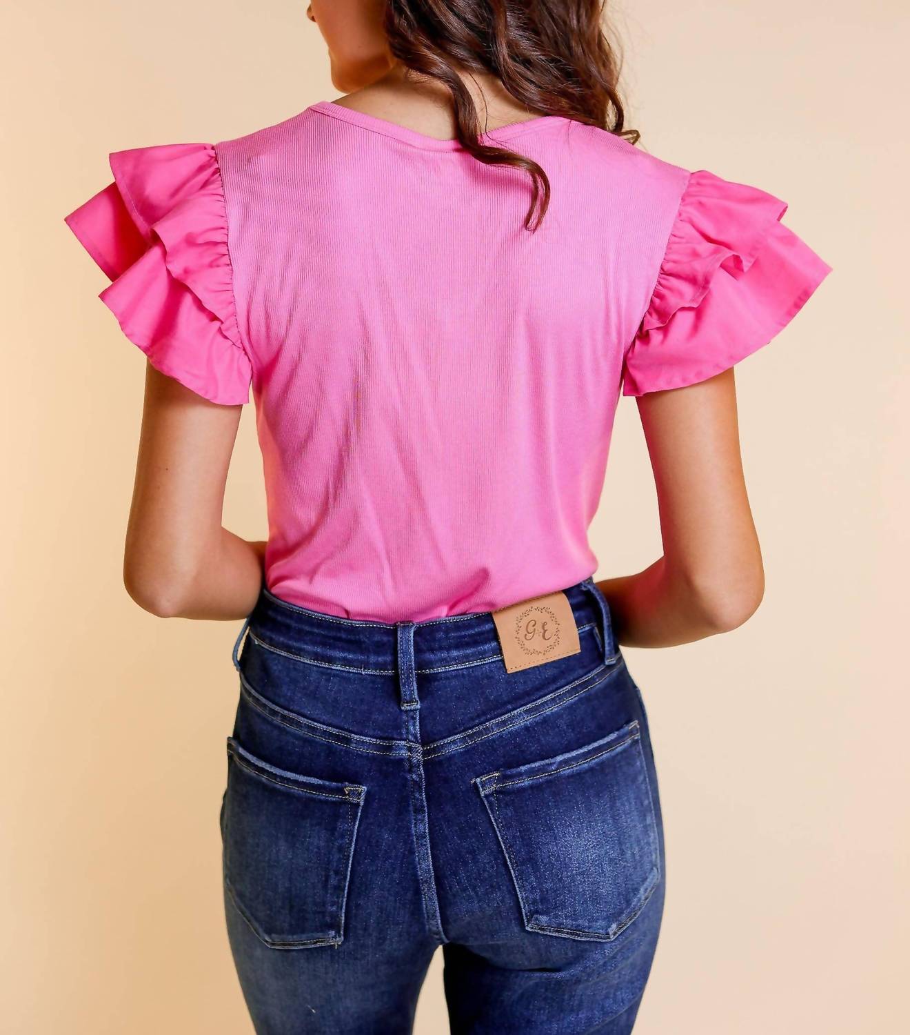 Form fitting and comfortable - this bodysuit check all of the boxes. Introducing the Love On Top Bodysuit by Southern Grace, a perfect addition to your summer wardrobe in a lovely pink shade. This fitted bodysuit features short sleeves, a V-neck, and is composed of 95% cotton and 5% spandex for a comfortable stretch. Designed with a solid pattern and ribbed fabric, it includes flirty ruffle detailing that enhances its feminine appeal. With a convenient pull-on closure, this versatile piece easily pairs with straight-leg denim and booties for a chic, casual look.