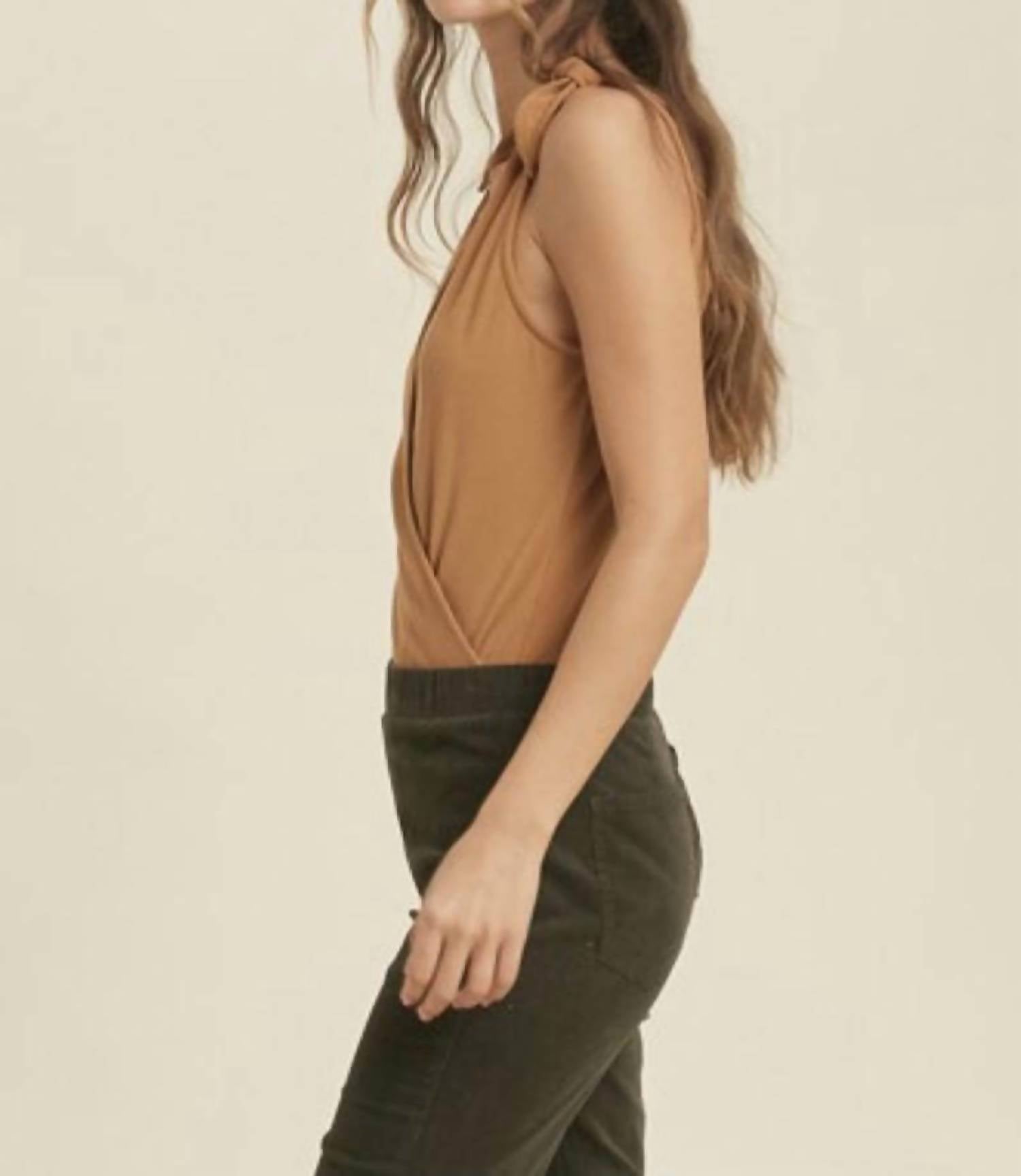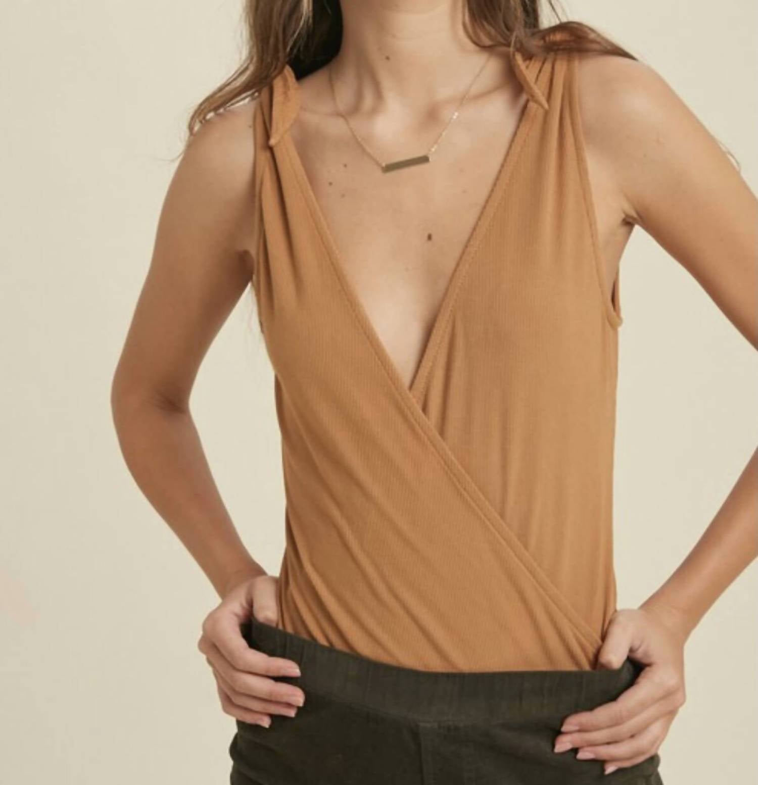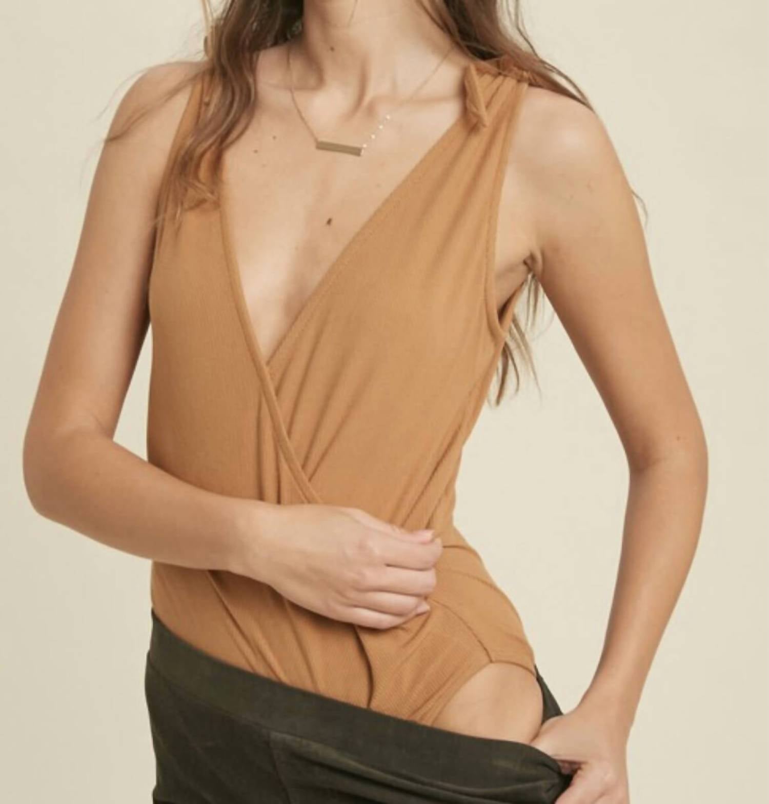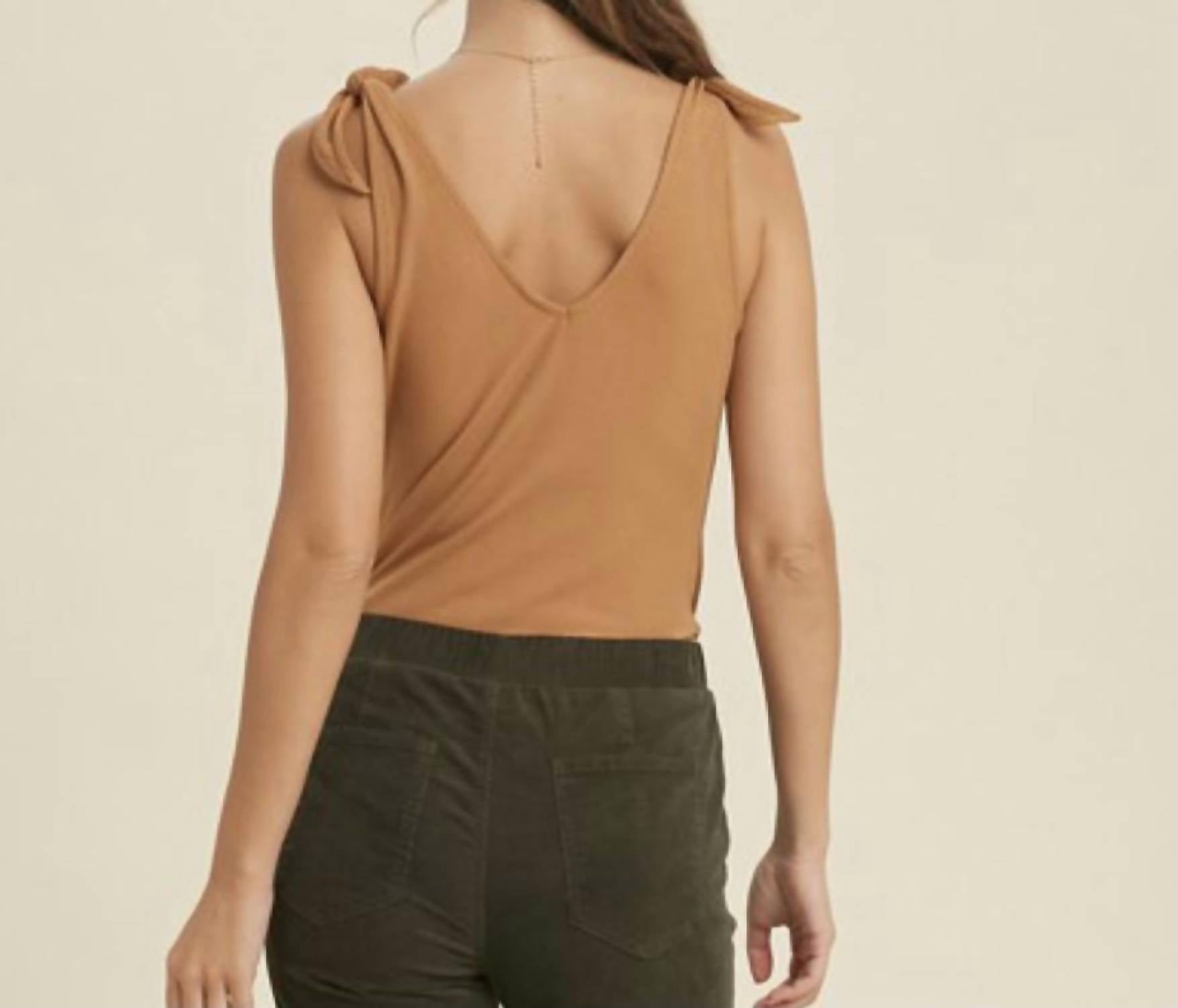 Form fitting and comfortable - this bodysuit check all of the boxes. Meet the Anna Shoulder Tie Bodysuit by WISHLIST, a chic layering piece perfect for transitioning from summer to fall. This sleeveless design is crafted from a soft, stretchy rib knit blend of 64% Rayon, 28% Acrylic, and 8% Spandex, featuring adjustable shoulder ties for a custom fit. The flattering surplus V-neckline complements the straight hemline, while the thong brief with a snap closure ensures a seamless look. Hand wash.