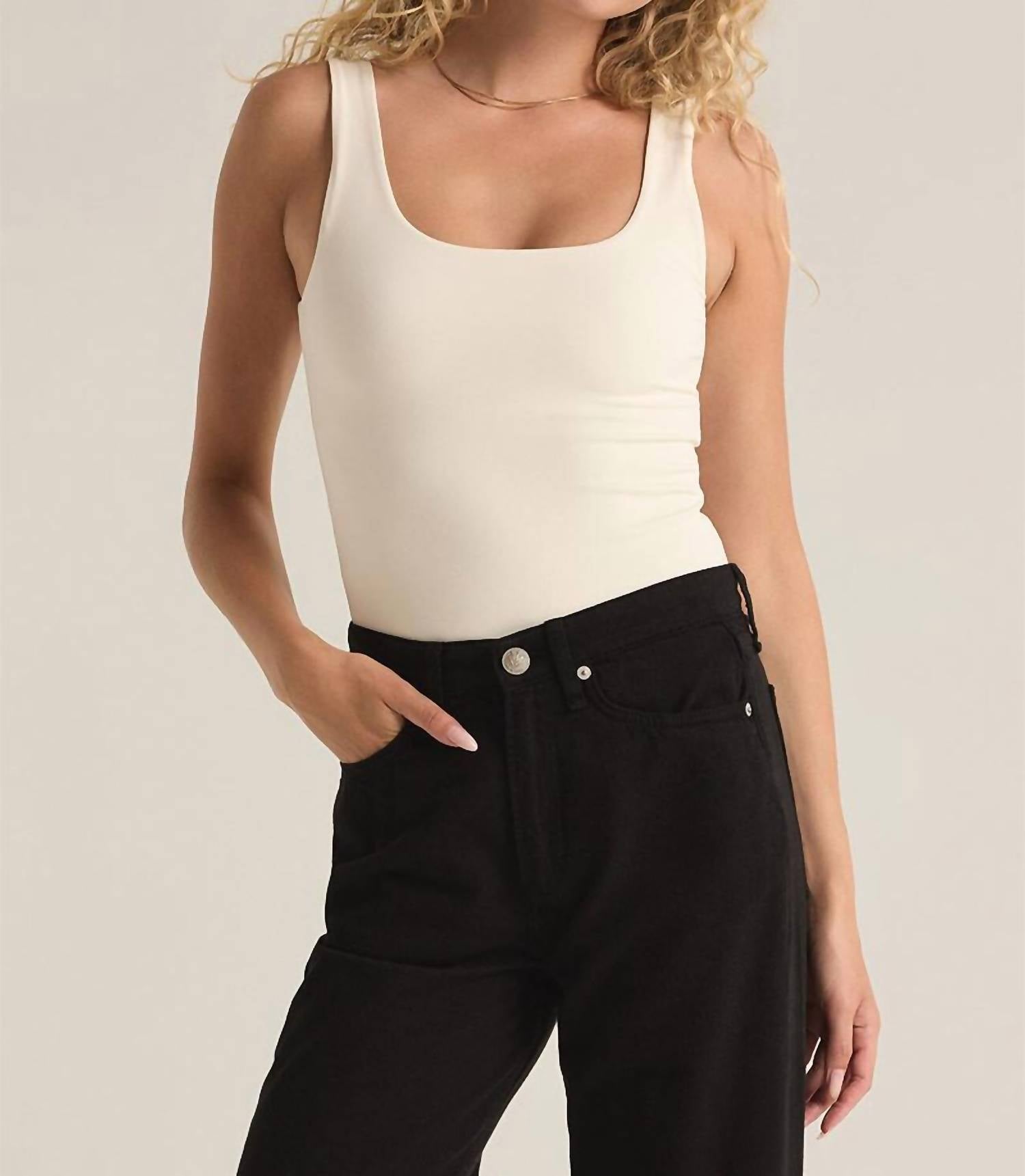 Pair this number with your favorite high-waisted jeans. Introducing the Vienna Scoop Neck Bodysuit by Z Supply, a minimalist essential in the elegant Sea Salt shade. Designed with a sleeveless silhouette, it’s crafted from a nylon blend of 80% Nylon and 20% Spandex. Featuring a convenient snap closure, it’s perfect for warm summer engagements and Easter celebrations. Care for this sleek piece by machine washing and laying flat to dry.
