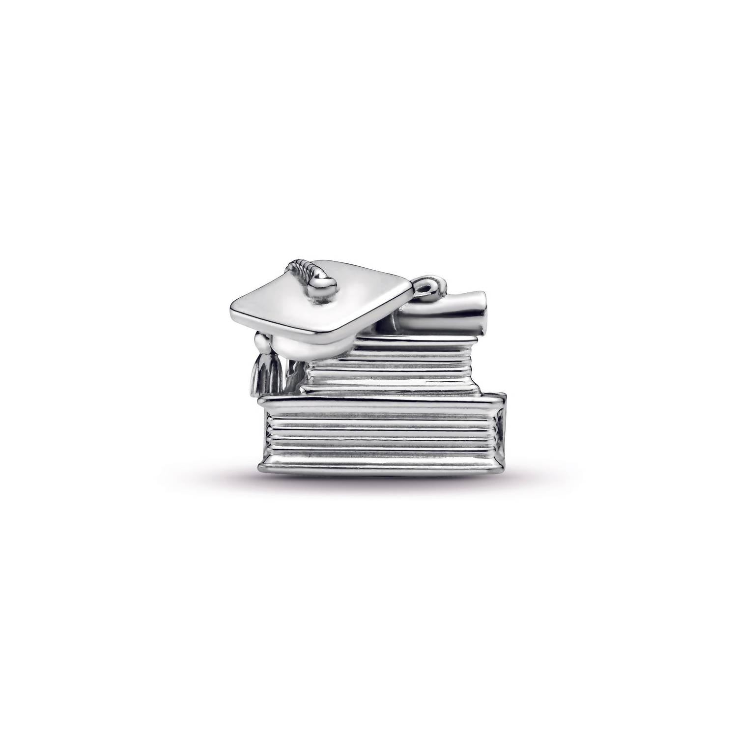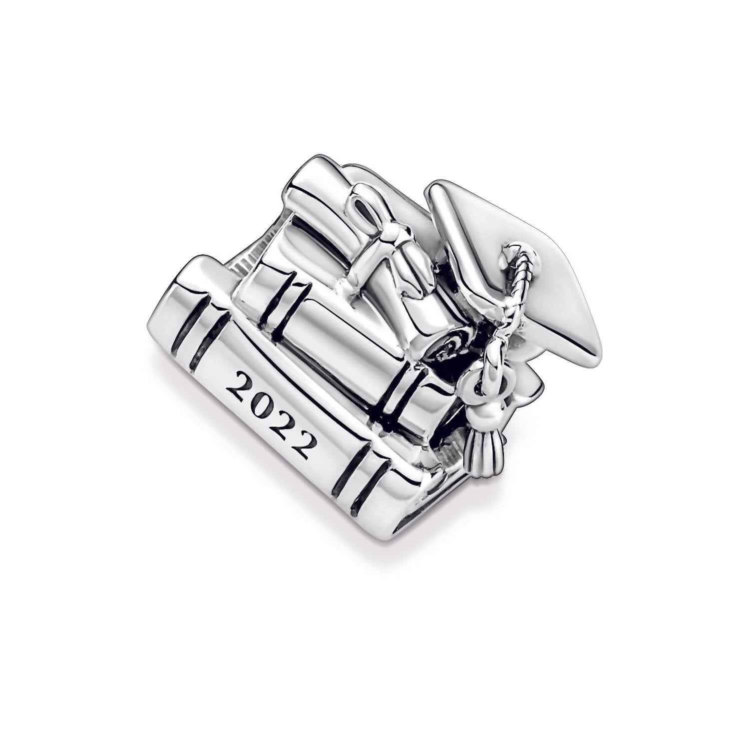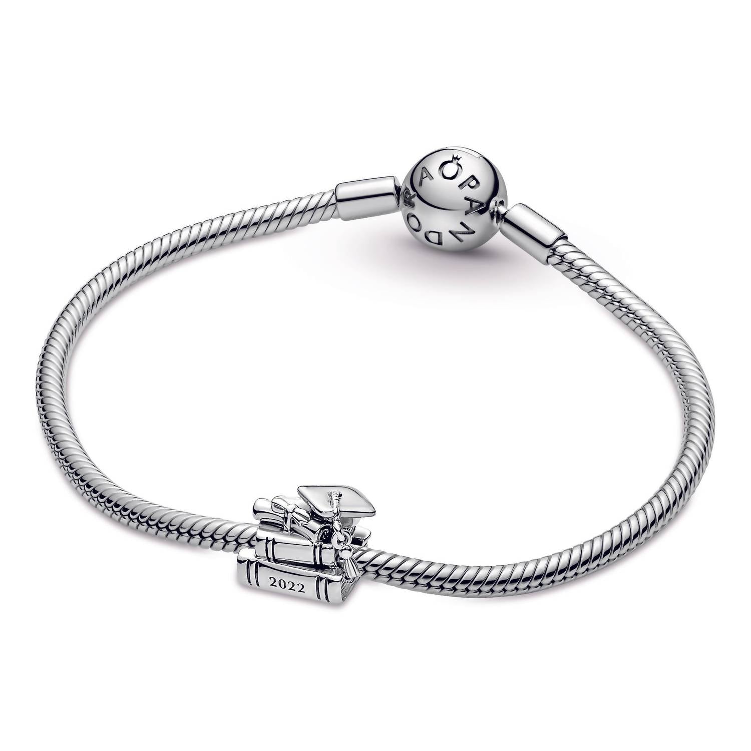 Stacked or solo - you can't go wrong with this bracelet. Commemorate achievements with the 2022 Graduation Charm by Pandora, a meaningful addition to any bracelet. Crafted from sterling silver, this charm features intricate details like a book stack, graduation scroll, and cap, complete with tassels. Adorned with cubic zirconia, it celebrates the spirit of graduation in a stylish fashion. Perfect as a gift to inspire and honor your loved one's success.