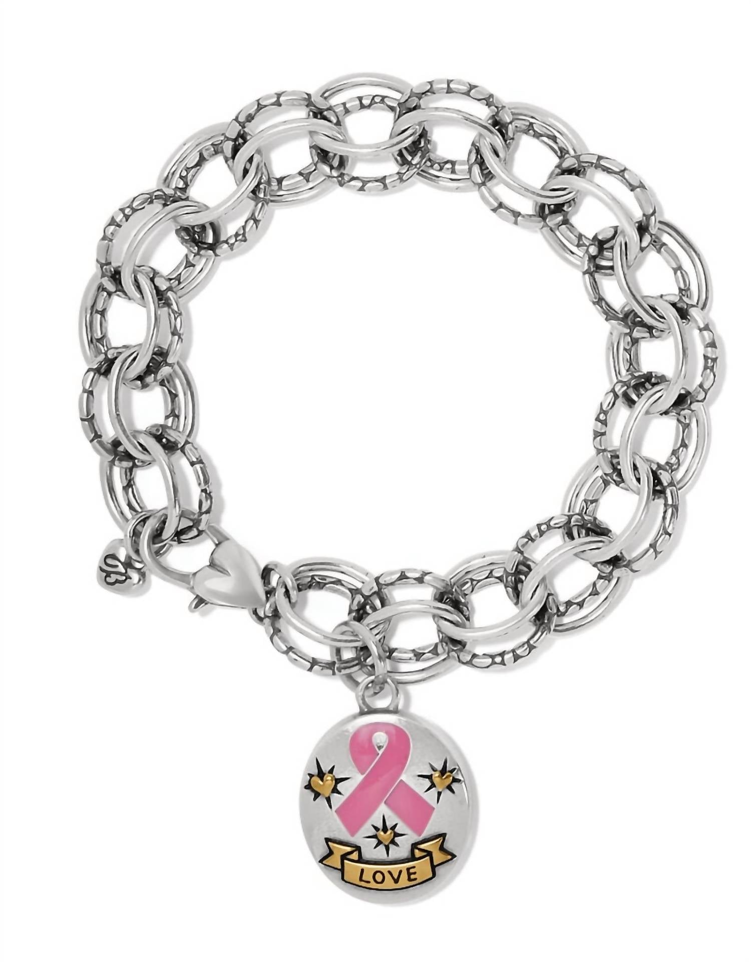 Stacked or solo - you can't go wrong with this bracelet. Introducing the Power Of Pink 2023 Bracelet by Brighton, a meaningful piece designed to represent love and support. With an overall length of 8 3/4" and a width of 1 3/4", this bracelet features a polished gold banner with "love" etched into it and a signature pink enameled ribbon. Crafted with a two-tone finish, the bracelet comes in a refined silver color and secures with a lobster claw closure. Perfect for fashion enthusiasts who care.