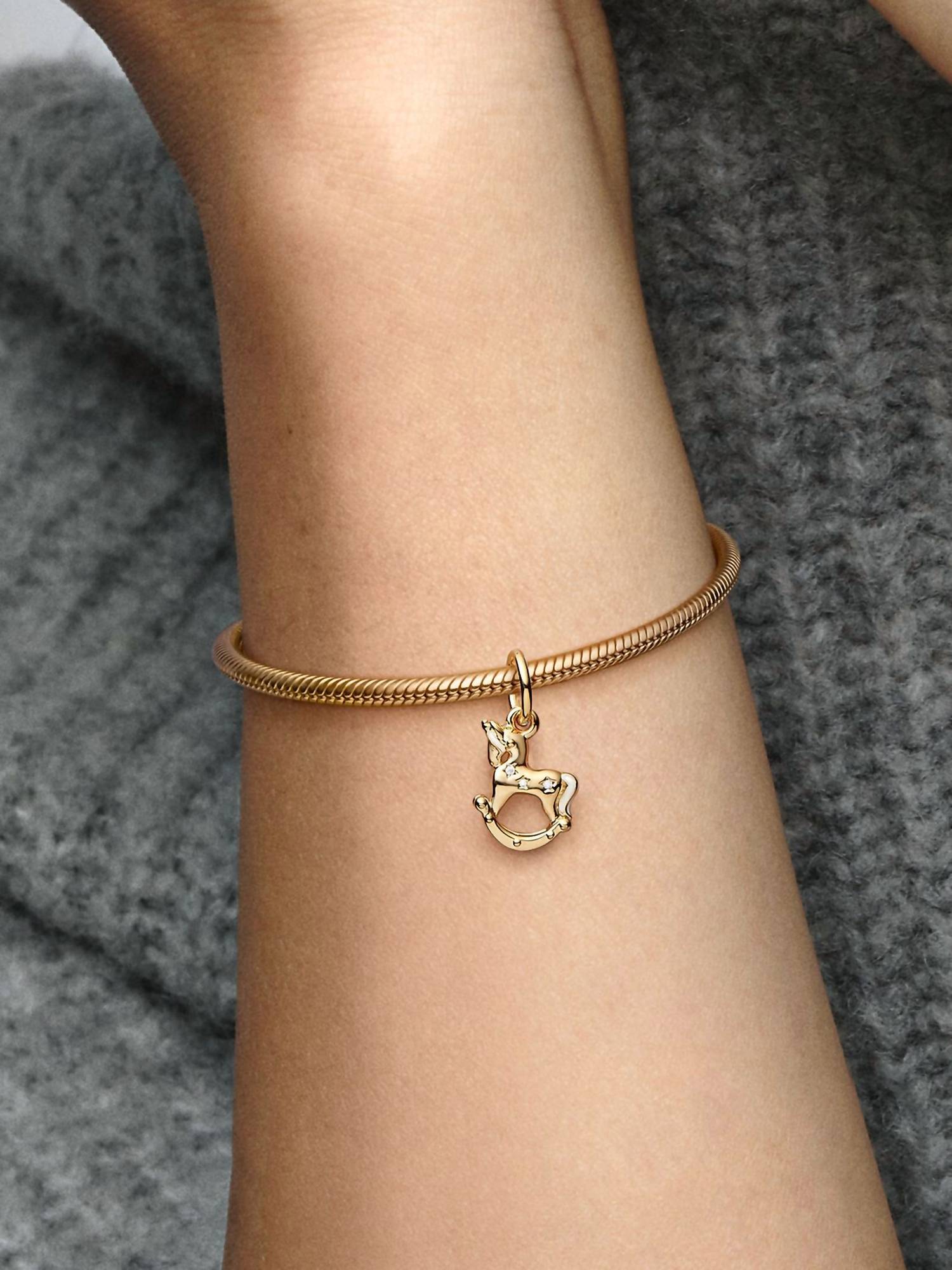 This stand-out bracelet is good enough to wear on its own, or stacked with your favorites. This charming piece is 14k gold-plated and features stunning snowy white enamel details on its mane, enhanced with sparkling cubic zirconia stones set in star shapes to evoke the magic of a winter wonderland. The charm measures 3.8mm deep, 15.1mm high, and 11.3mm wide, making it a delightful accessory for any festive ensemble.