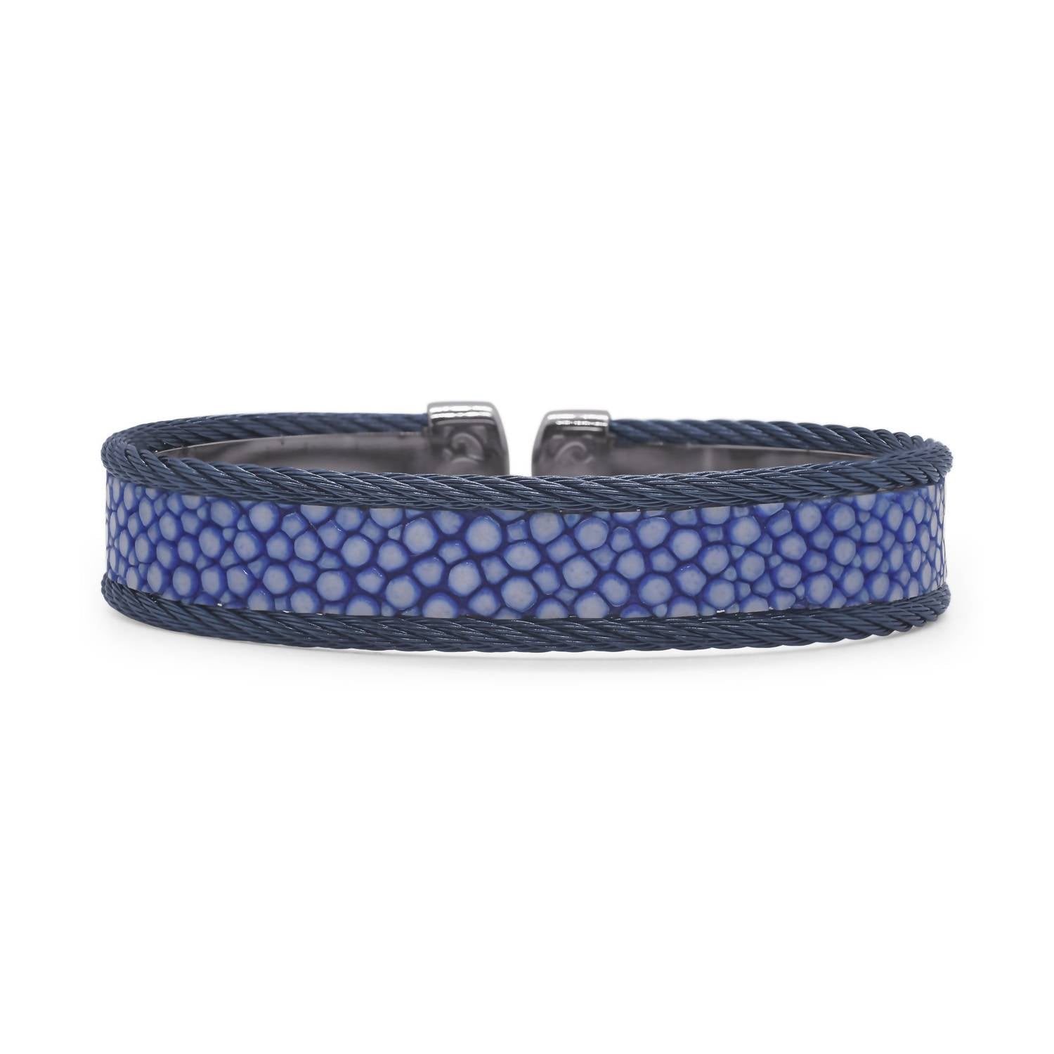 This stand-out bracelet is good enough to wear on its own, or stacked with your favorites. Introducing the ALOR Stingray Mini Cuff, a statement piece that combines luxury and style in a striking Blueberry hue. This bracelet features a distinctive stingray center framed by a sleek cable border, crafted from high-quality stainless steel for durability and elegance. It is imported, ensuring a unique touch to your fashion jewelry collection. Ideal for adding a sophisticated edge to your ensemble.