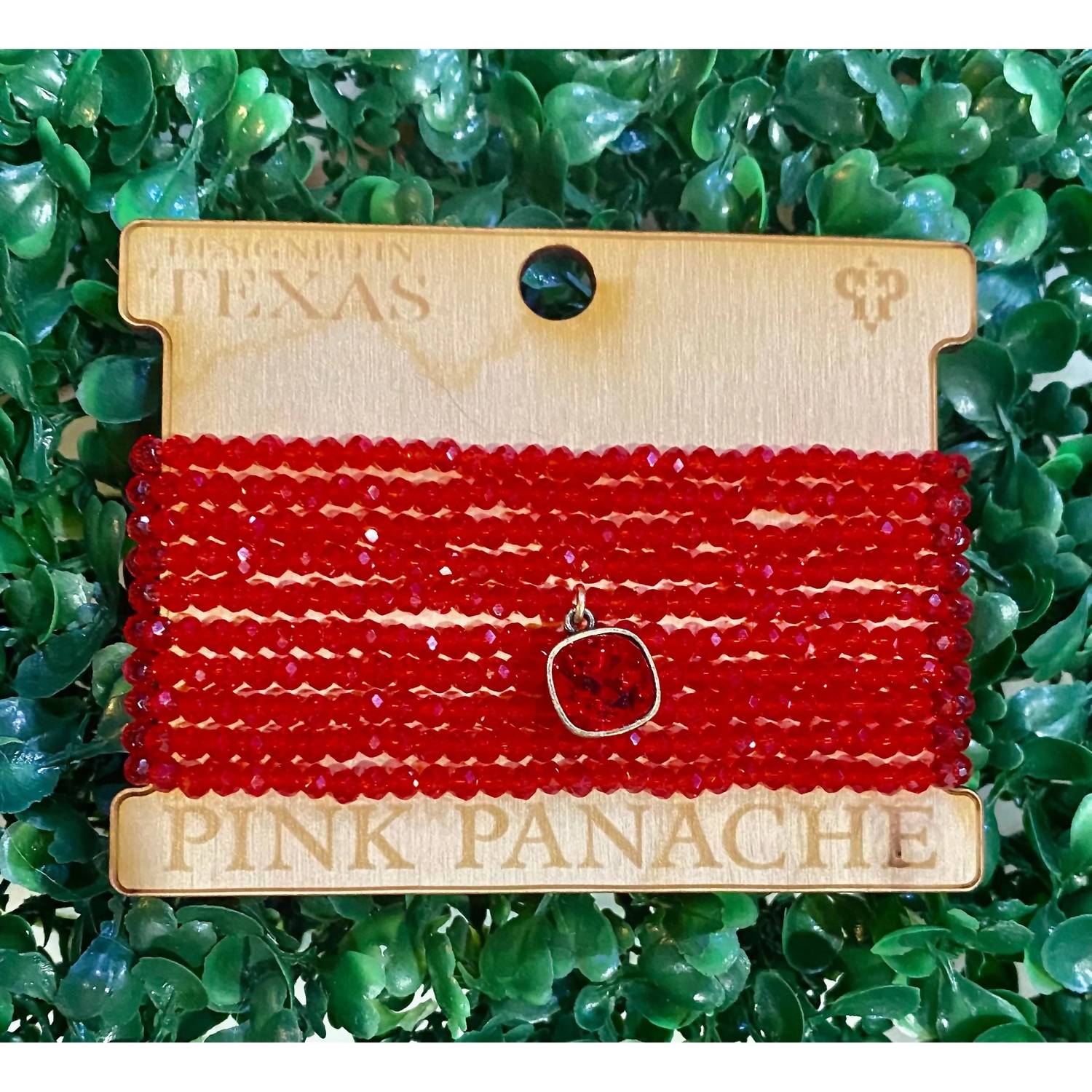 This stand-out bracelet is good enough to wear on its own, or stacked with your favorites. This handcrafted set features ten strands of red faceted beads, accented with a sparkling red crystal charm to add festive allure to any ensemble. Made in Texas, it showcases versatility with the option to wear as a bold set or individually for a more refined look.
