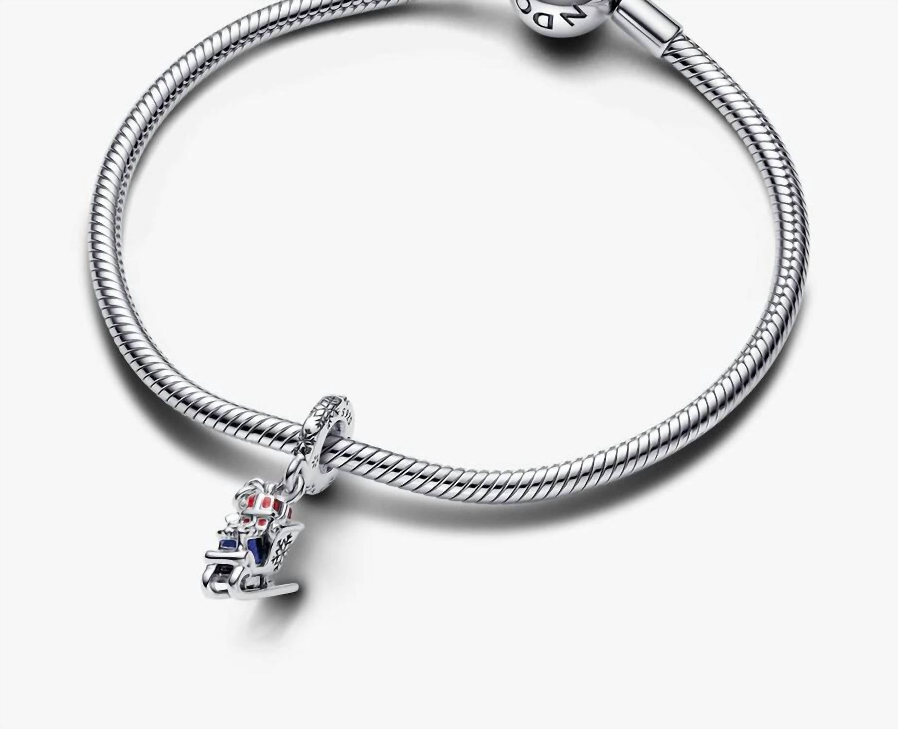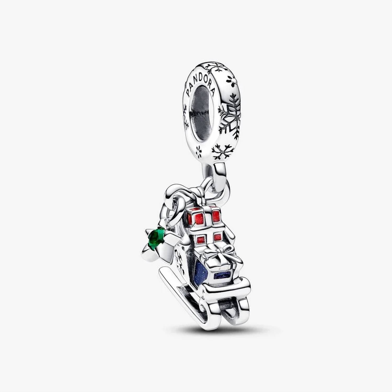 Stacked or solo - you can't go wrong with this bracelet. Celebrate the festive season with the Christmas Sleigh 2023 Dangle Charm from Pandora, crafted from sterling silver and adorned with glittery red and blue enamel. This charming piece features snowflake imprints and an engraved sleigh, capturing the joyful spirit of the holidays. Dimensions include a depth of 6.8 mm, height of 13.5 mm, and width of 10 mm. Enhance your holiday look with this dazzling charm or carry its festive cheer throughout the year.