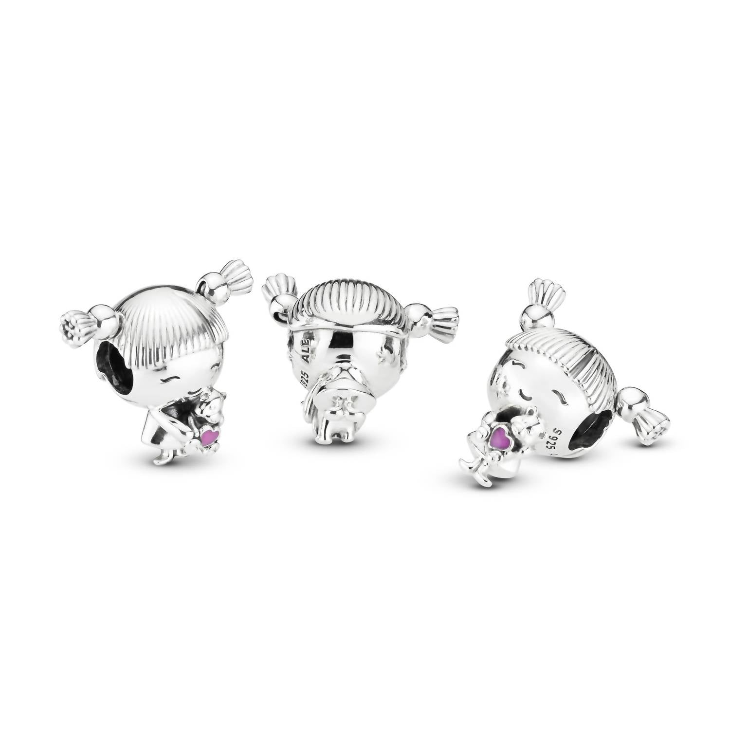 This stand-out bracelet is good enough to wear on its own, or stacked with your favorites. Embrace family moments with the Little Girl Charm by Pandora, crafted in lustrous sterling silver. This delightful piece features a charming girl with pigtails, holding Theodore Bear, who cradles a pink enamel heart. Made from high-quality sterling silver and enamel, this charm is perfect for adding a touch of playful elegance to your Pandora Moments bracelet. Ideal for both big and little girls, it embodies the joy of cherished memories.