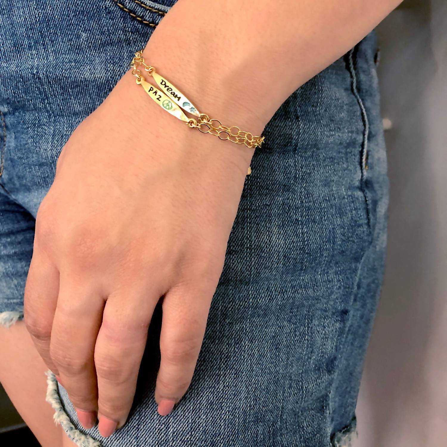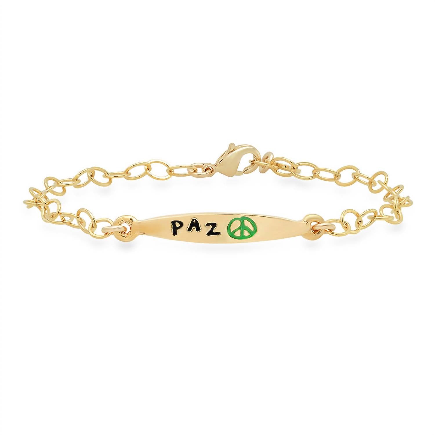 Elevate your everyday style with the Vermeil Colorful Words Enamel Bracelet - Paz by Jessica Elliot. This hand-enameled bracelet features an 18k plated sterling pendant on a gold-filled, 7 1/4" adjustable chain. Delightfully made in the USA, this piece adds a meaningful touch to any outfit. Whether for yourself or as a thoughtful gift, it's a beautiful reminder to carry with you.