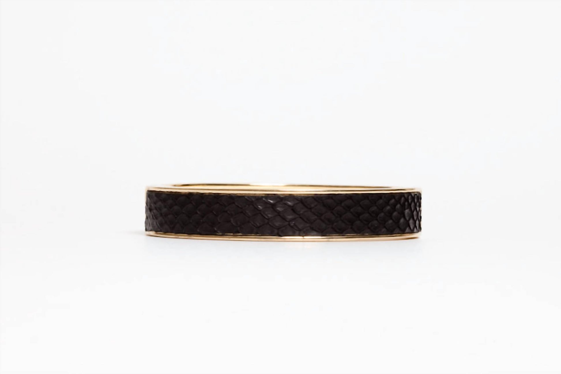 This stand-out bracelet is good enough to wear on its own, or stacked with your favorites. Elevate your accessory game with this exquisite piece boasts a genuine python leather inlay, masterfully set atop a 14kt gold-plated hinge, measuring 0.5 inches wide with a 2.5-inch inner diameter. Proudly made in US. Offers a touch of luxury and versatility for any outfit. Mix and match with other colors to suit your mood.