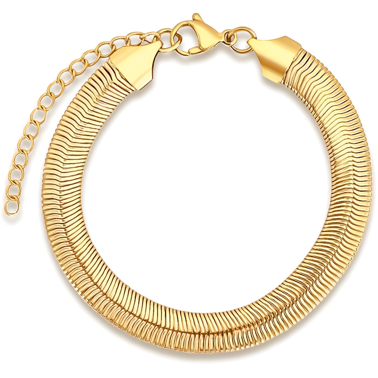This bracelet will be your favorite go-to piece of the season. Discover the Reggie Snake Chain Bracelet by Ellie Vail, an elegant accessory in luxurious gold. This bracelet is crafted from durable stainless steel with a width of 8 mm, offering a versatile 7-inch length and an additional 2-inch extension for the perfect fit. It features a secure lobster clasp and is hypoallergenic, ideal for those with sensitive skin. Enjoy its water-resistant properties as an added bonus for everyday wear.