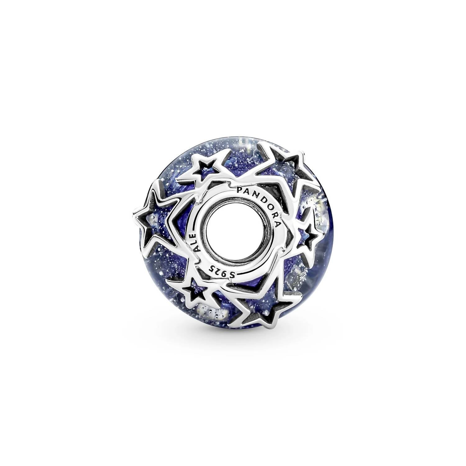 This bracelet will be your favorite go-to piece of the season. Discover the enchanting Women's Galaxy & Star Murano Charm by Pandora, a celestial accessory that captures the night's allure. This fine blue charm is crafted with glittery Murano glass and hand-finished in sterling silver, adorned with asymmetric cut-out silver stars. Material: Sterling Silver and Murano Glass. Perfect for those who wish to carry the universe's magic wherever they go or as a thoughtful gift to convey your care.