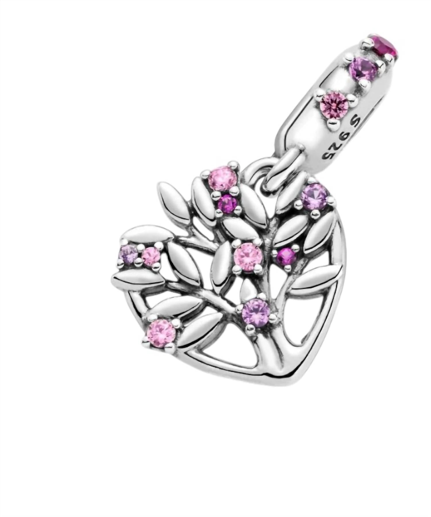 Stacked or solo - you can't go wrong with this bracelet. Celebrate family ties with the Women's Heart Family Tree Dangle Charm by Pandora. Crafted from sterling silver, this fine jewelry piece features an eye-catching openwork heart design with a tree and pink stones for added elegance. Its dimensions are 2.2mm deep, 13mm high, and 12.8mm wide, adding a delicate charm to any bracelet. Hand-finished to meet high-quality standards, it is a beautiful keepsake that can be paired with other family-inspired Pandora Moments charms.