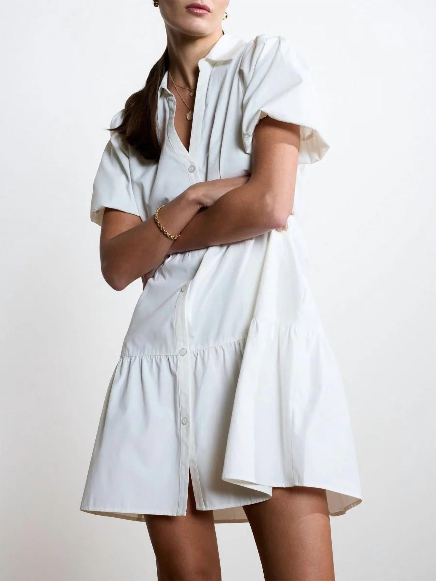 The perfect mini dress for those warmer months. Runs true to size Relaxed fit Mini length, 36" on size Small Chest Measurements: XS: 36” / S: 37 ½” / M: 39 ½” / L: 42 ½” Tiered skirt V-neckline Button front placket Puff sleeves On seam pockets 65% Polyester/35% Cotton Imported Our most loved Havana Dress is now available in a new mini length. Like its big sister, a tiered skirt and puff sleeves give a definitive feminine appeal, while the collared V-neck and button front placket, make it as chic as it is versatile. We added on seam pockets for added functionality making it perfect for every day, everywhere.