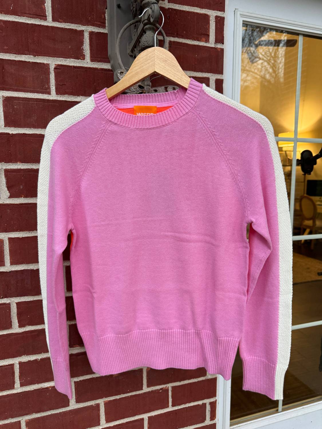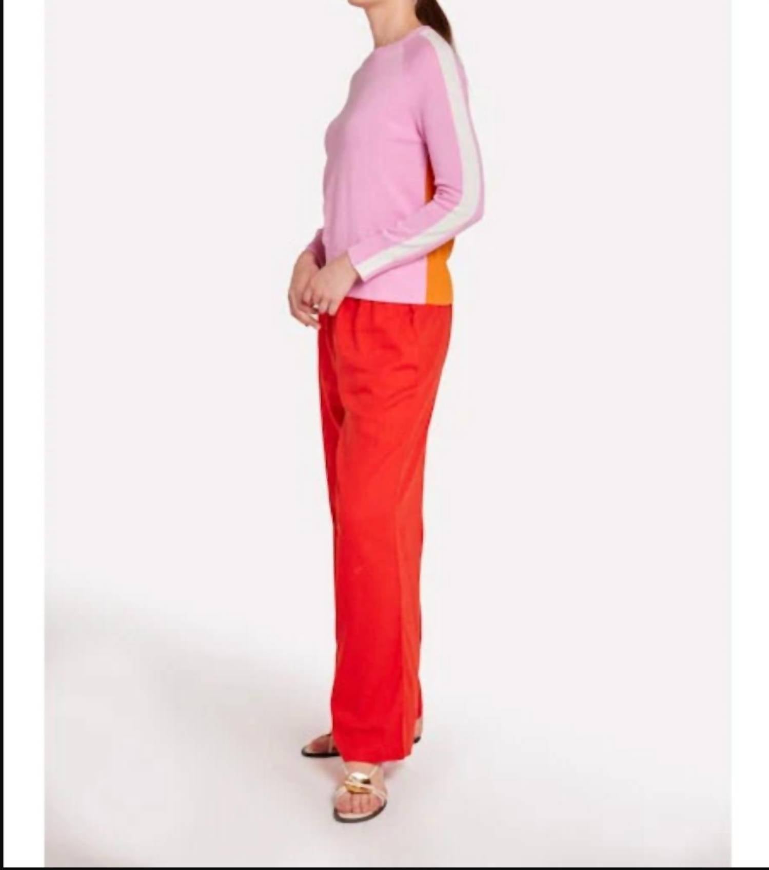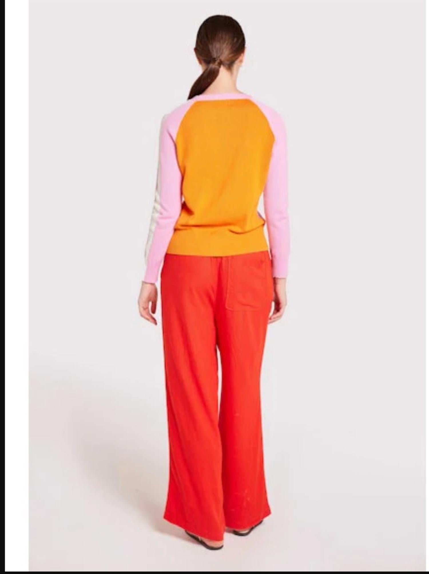 A long sleeve top you can wear with denim, skirts, well... just about anything! Embrace the vibrant charm of the Summer Stripe Up Crew Neck Tee by Brodie Cashmere, a standout piece for sunny days. This women's long-sleeve sweater combines the lightweight comfort of cotton and silk, featuring a unique pink front and an orange back. Its chic design is accentuated by a white stripe down the sleeve, ideal for streetwear and holiday parties alike. Composition: 70% Cotton, 20% Nylon, 10% Silk. Closure: Pull on. Care: Machine wash and line dry. The X-small size measures 22" in length, designed to fit true to size.