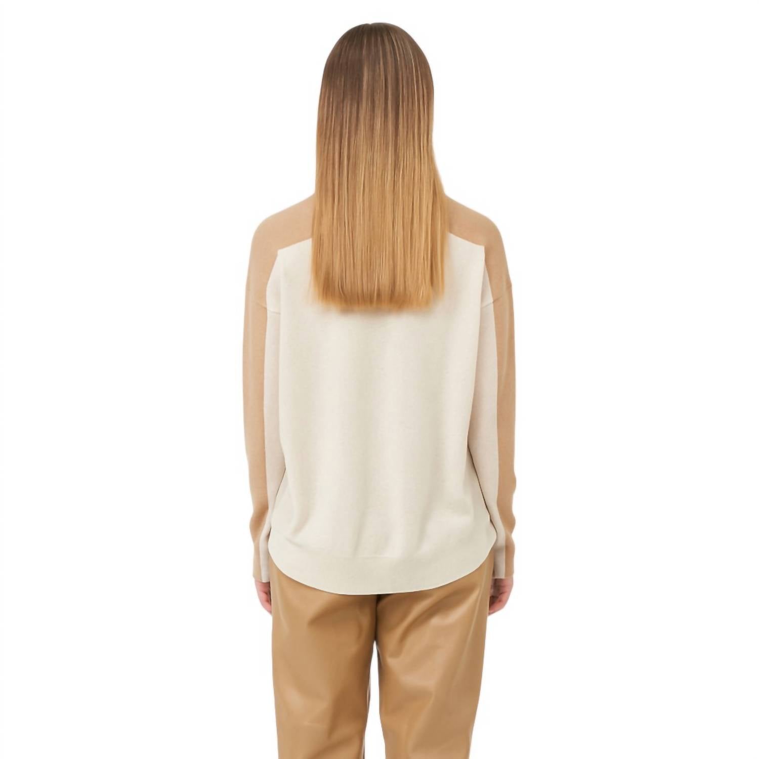 Fit to perfection and effortlessly chic. Introducing the Frida Colorblock Sweater by Brodie Cashmere, a fall essential crafted for both comfort and style. This long sleeve turtleneck is spun from 100% pure cashmere, offering luxurious softness that’s sustainably produced in Mongolia. With a pull-on closure and eye-catching color blocks in camel and antique white, this textured sweater is perfect for both travel and casual outings. Care is simple with machine wash instructions, ensuring that its vibrant appeal lasts.