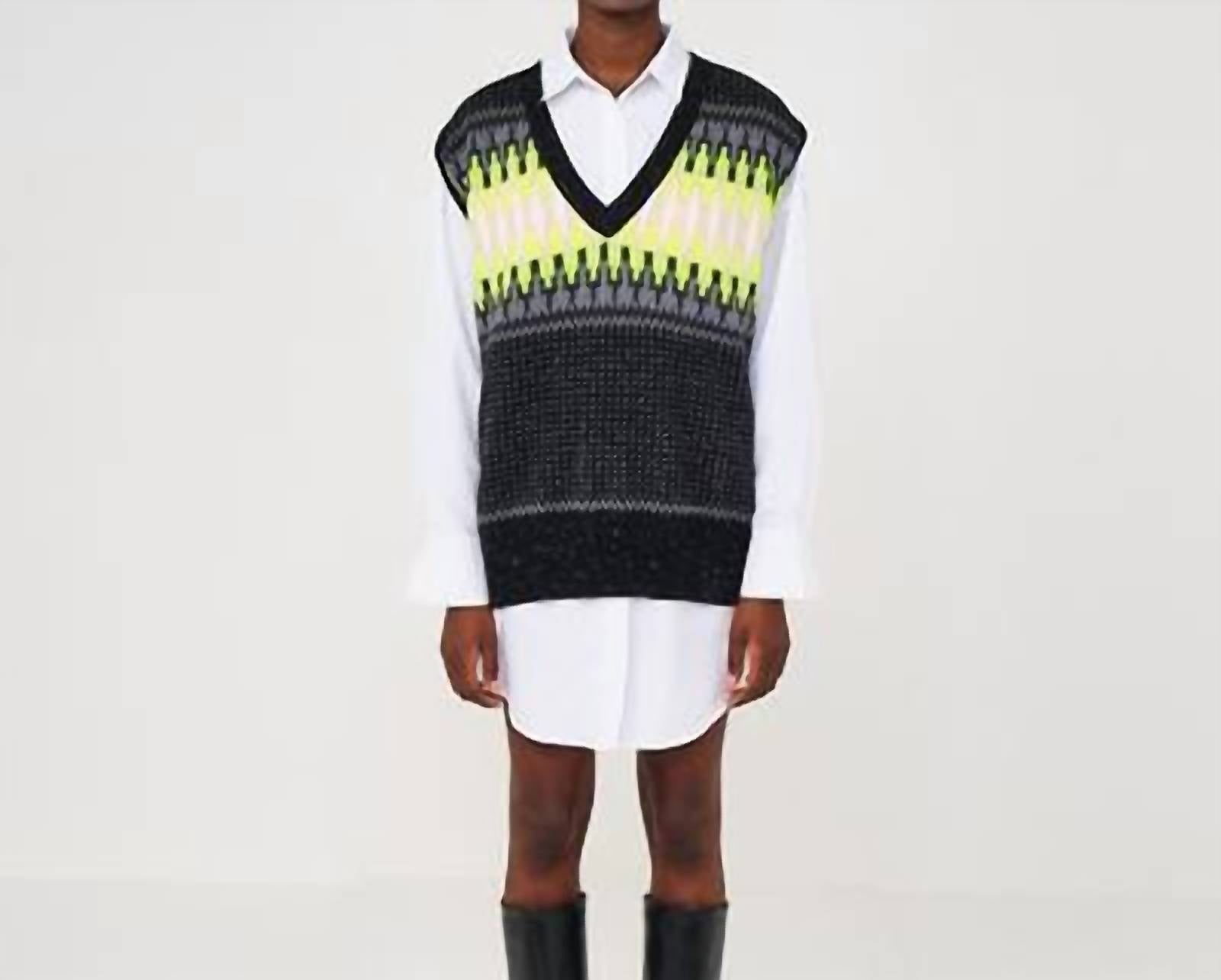 That extra layering piece you didn't know you needed! Elevate your fall wardrobe with the Electric Fairisle Cashmere Sweater Vest by Brodie Cashmere, a chic addition perfect for workwear and festive occasions like Thanksgiving. This sleeveless vest features a vibrant multicolor fairisle pattern with a V-neck design, ensuring a stylish look for dinner parties. Crafted from a premium cashmere blend, the sweater offers luxurious comfort with a pull-on closure. Care is simple with hand wash instructions, making it an effortless choice for your cold-weather attire.