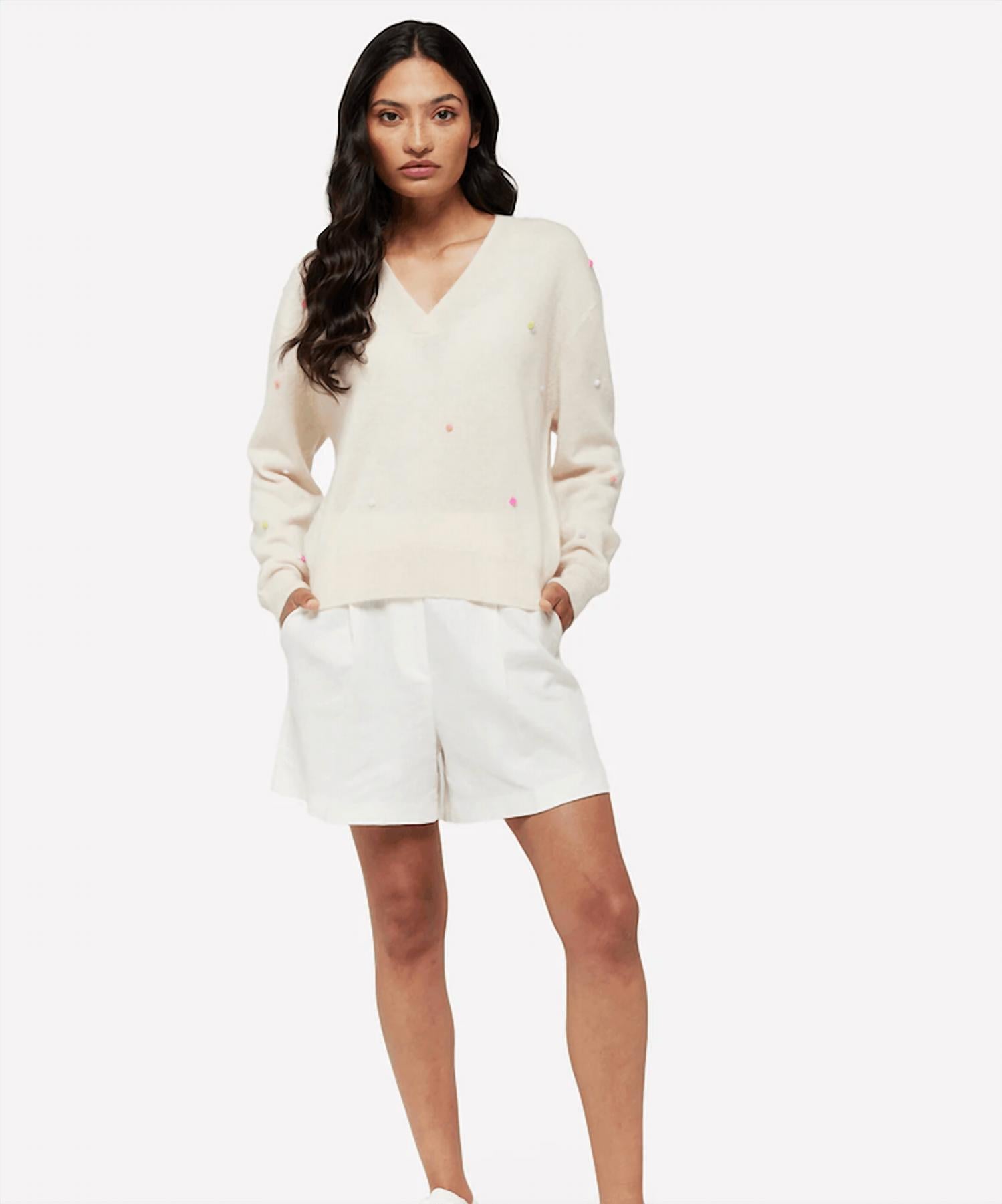 You'll be reaching for this comfy and classic v-neck sweater all season long. Elevate your fall wardrobe with the Little Pom Millie V-neck Jumper by Brodie Cashmere, a sophisticated blend of texture and style. This women's V-neck jumper in Antique White boasts a textured design and long sleeves for a chic preppy look, perfect for Thanksgiving travel. Made entirely from 100% luxurious cashmere, it features a convenient pull-on closure and offers the ultimate in soft comfort. For best care, hand wash and line dry only.