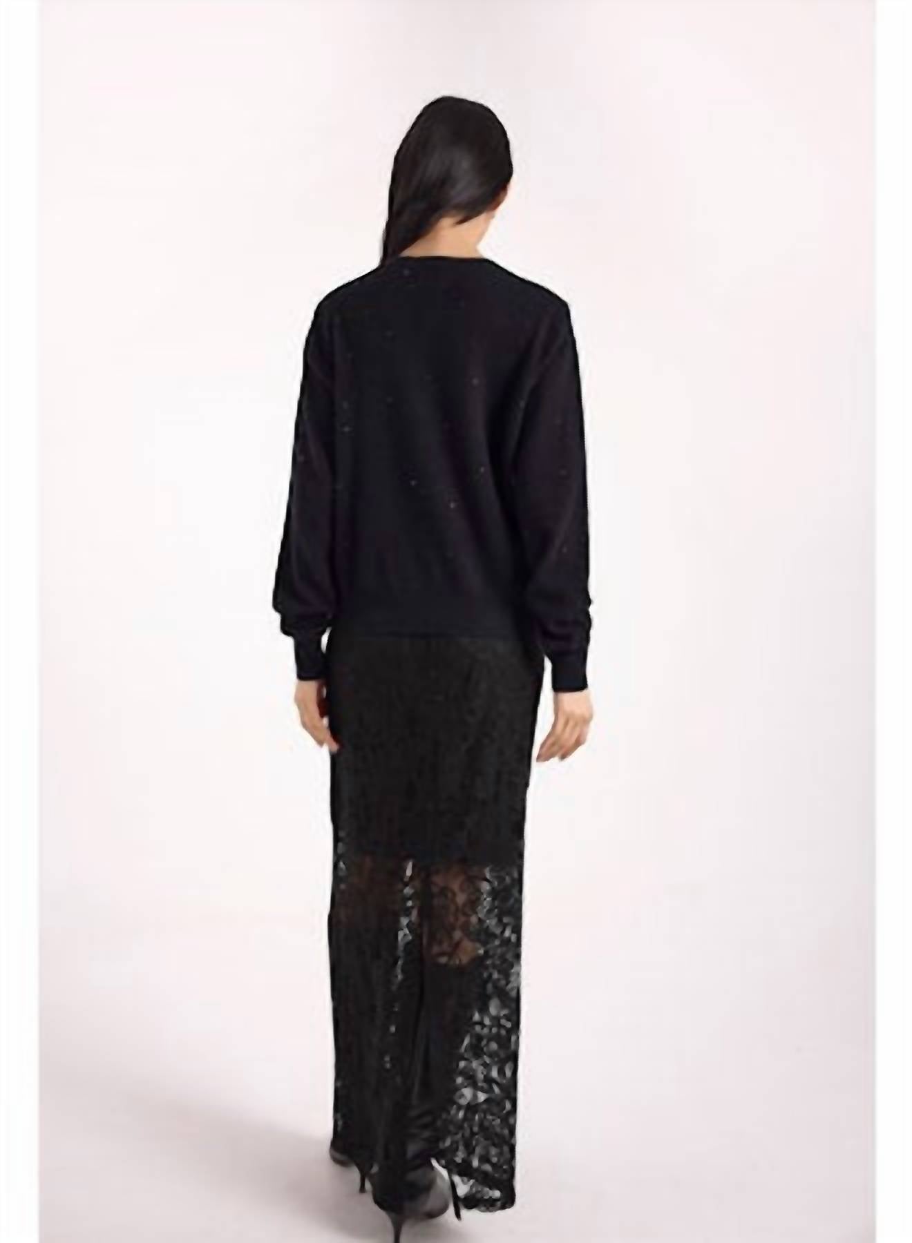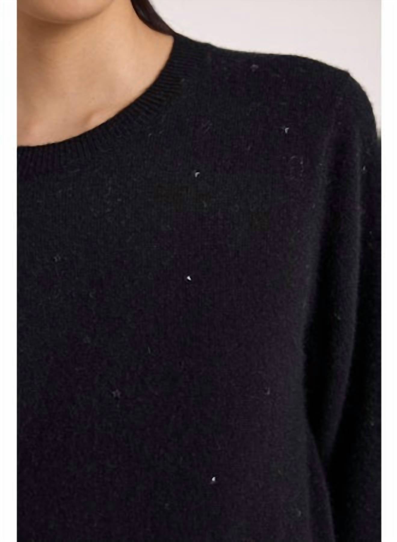 Stay warm and stylish in this versatile and effortlessly cool knitwear staple. Wear it alone or layered, it's the perfect sweater for the season and you'll wish you had it in every color. Introducing the Gem Star Crew Neck Cashmere Sweater by Brodie Cashmere, a luxurious addition to your wardrobe in classic black. This elegant piece features long sleeves and a subtle boatneck, crafted from the finest Mongolian cashmere known for its exceptional softness. Closure: Pull-on. Perfect for spring, whether layering for a dinner party or worn solo, this sweater is a minimalist's dream with its subtle rhinestone embellishments.