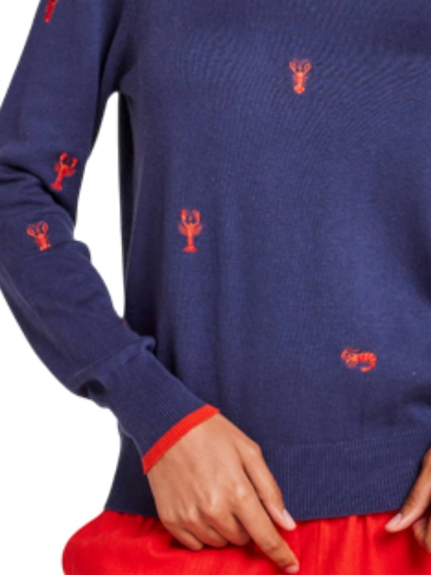Experience the perfect blend of comfort and style with this trendy crew neck sweater, designed to effortlessly elevate your wardrobe. Pair it with your favorite denim and loafers for the perfect look. Elevate your wardrobe with the Lobster Crew Sweater by Brodie Cashmere, a chic addition for preppy fall fashion. Crafted as a lightweight summer sweater, it features long sleeves and a classic crew neck design, adorned with a charming red lobster embroidery. This patterned gem is composed of a luxurious blend of 70% cotton, 20% nylon, and 10% silk for a soft and breathable feel. With a convenient pull-on closure, it's a perfect choice for travel or Thanksgiving gatherings.