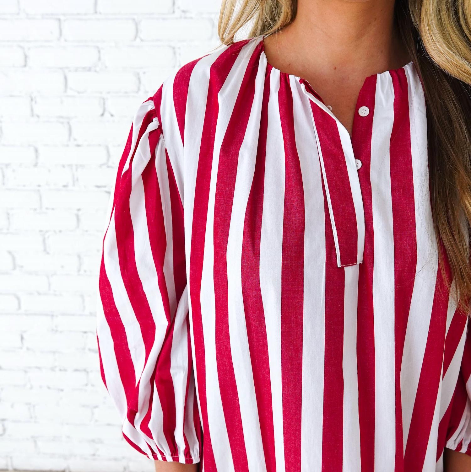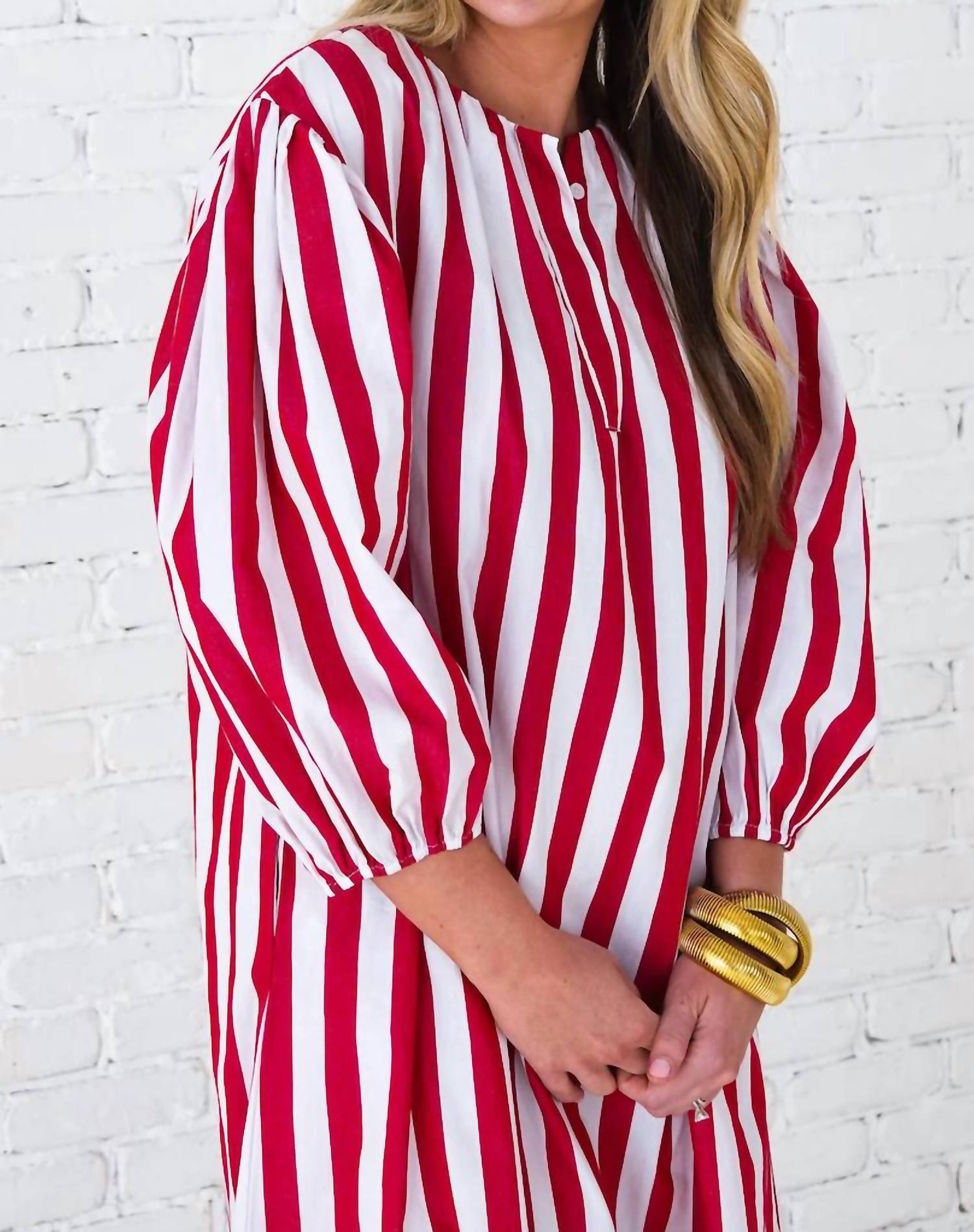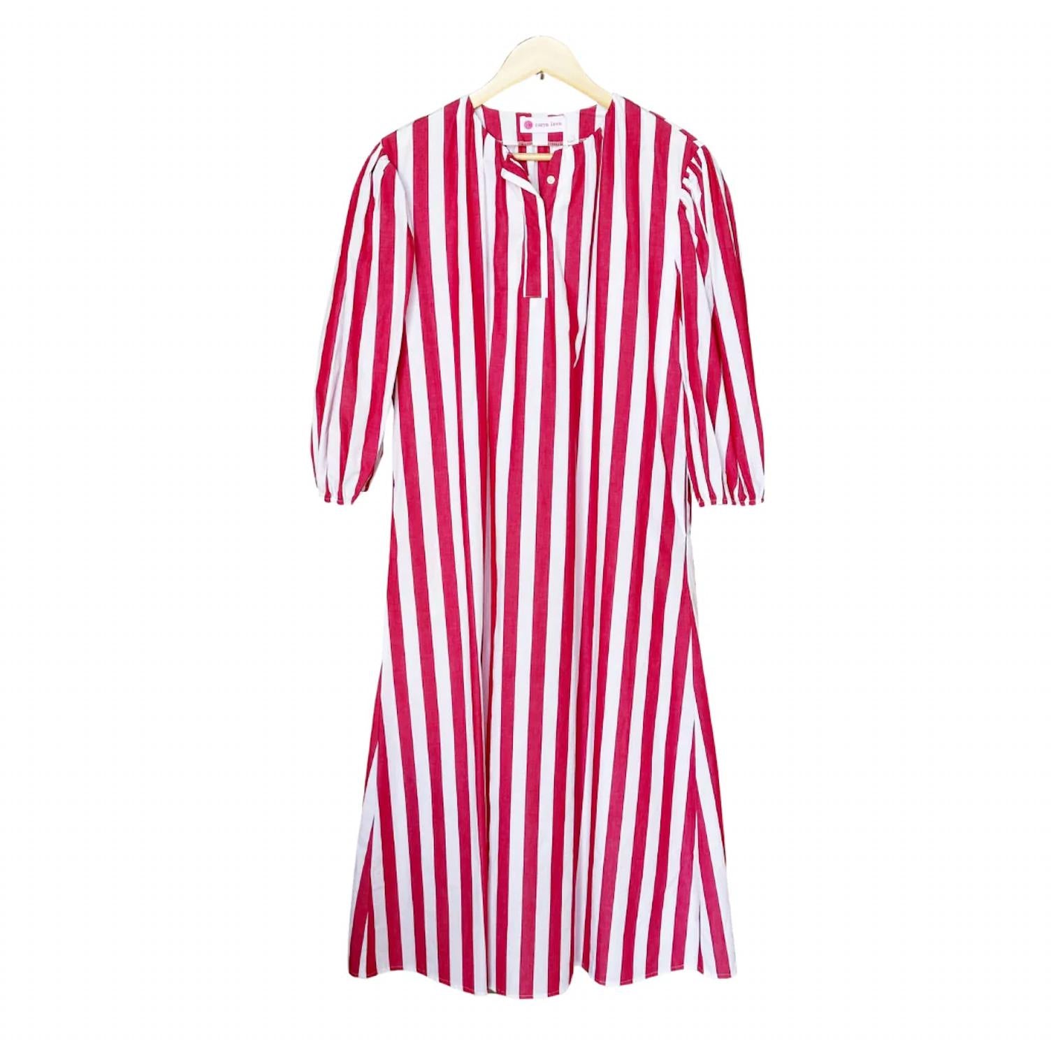 The pefect long sleeve dress for those cooler months. Embrace effortless style with the Caryn Lawn Cabana Maxi Dress, perfect for a summer vacation look. Featuring three-quarter sleeves and a classic shift silhouette, this dress comes in a vibrant red stripe pattern that exudes boho chic vibes. Designed with a collared neckline and handy pockets, it offers the convenience of a pull-on closure. Care is made simple with machine wash and tumble dry instructions, while the one-size-fits-most design accommodates sizes 4-12.