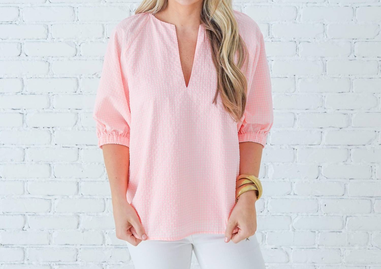 A timeless blouse that will never go out of style. The Women's Betsy Top by Caryn Lawn is the epitome of boho chic with its playful baby pink gingham pattern, perfect for summer vacations. This blouse features a V-neckline and short sleeves in a loose, stretchy design, providing comfort for sizes 4 to 12. Crafted from a 50% Cotton and 50% Polyester blend, it offers a boxy fit with a longer back and lined front, ideal for a trendy front tuck look with jeans. Closure: Pull-on. Care: Machine wash cold on a gentle cycle.