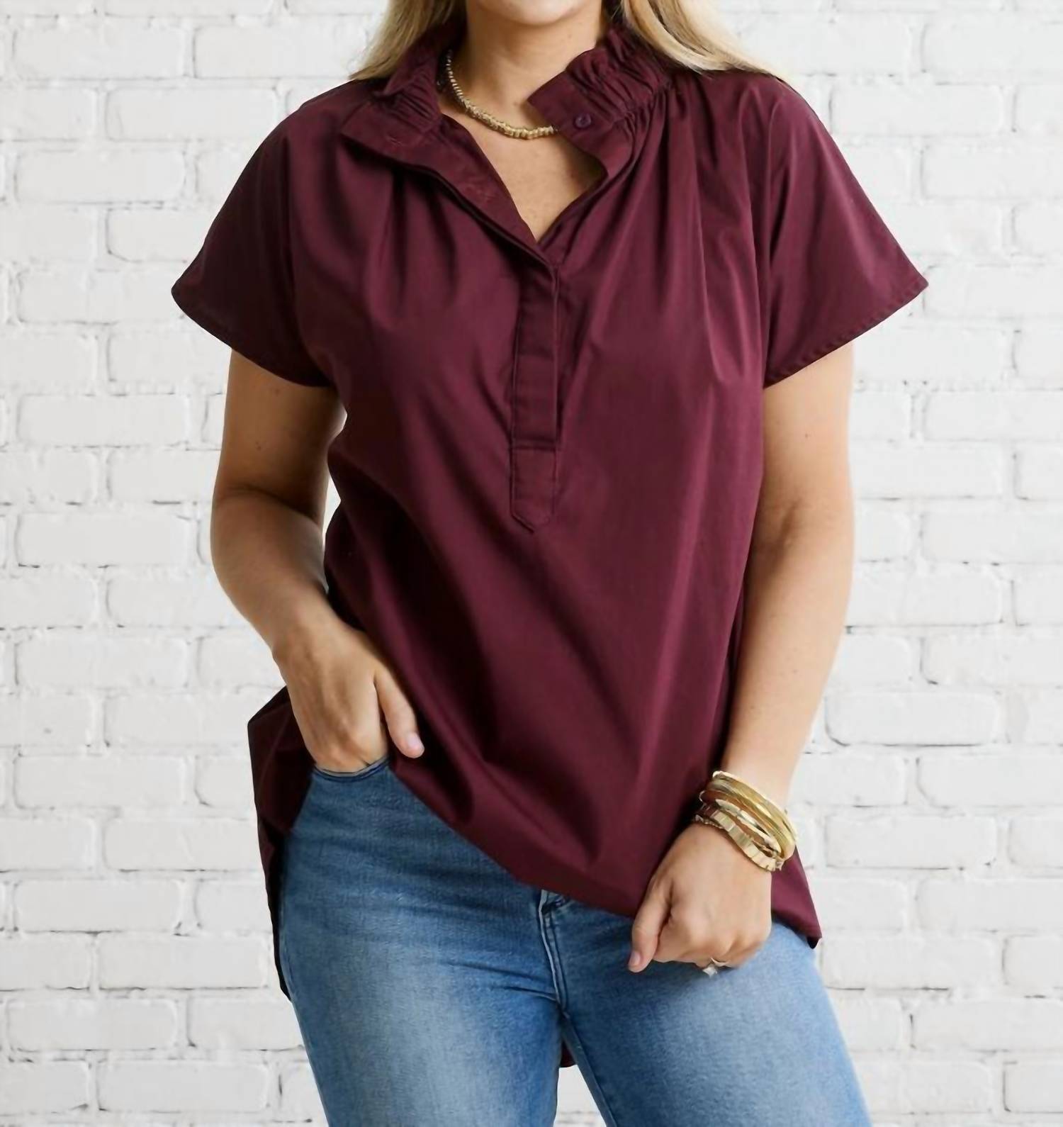 A versatile blouse that works from desk to dinner! Discover effortless elegance with the Caryn Lawn Emily One Size Top, crafted in a rich burgundy hue. This short-sleeve blouse features a classic collar and a minimalist, solid pattern, perfect for your spring engagements or Thanksgiving gatherings. Closure: Button closure. Embrace the carefree design that pairs beautifully with your favorite denim, making it a standout piece for any occasion.