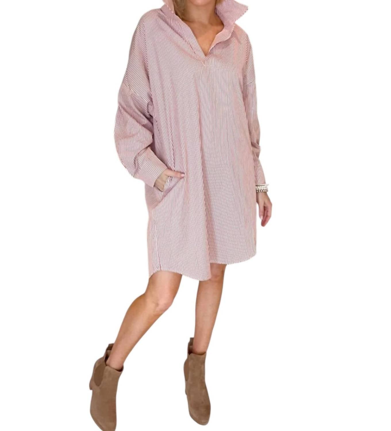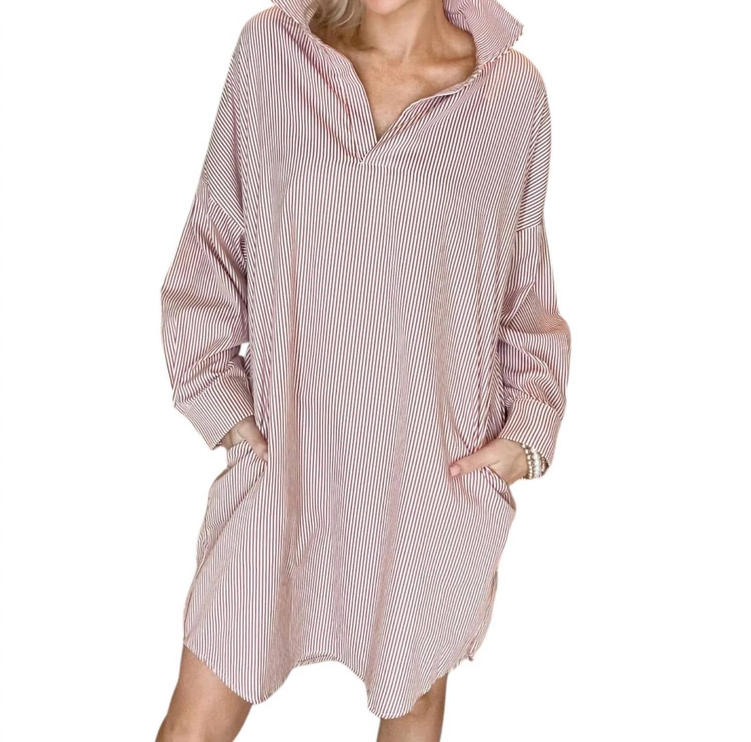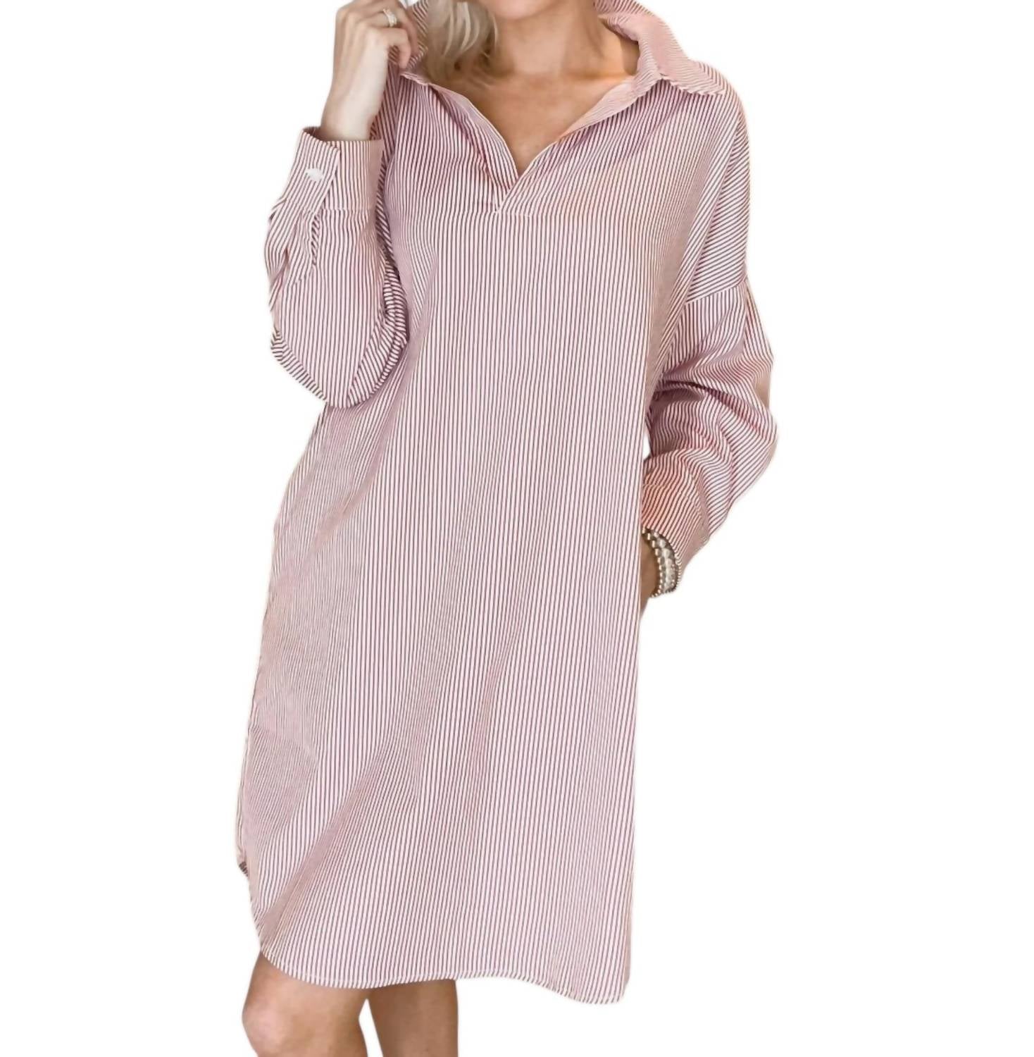 The pefect long sleeve dress for those cooler months. Embrace casual chic with the Preppy Game Day Striped Dress by Caryn Lawn, crafted from luxurious cotton poplin with hand-stitched details. This women's long-sleeve shirt dress features a striking red stripe pattern and a collared neckline, offering a perfect blend of preppy and relaxed style. Designed with a convenient pull-on closure and practical pockets, this one-size-fits-most dress comfortably accommodates sizes 4 to 12. Care for your garment with dry cleaning to maintain its chic appearance.