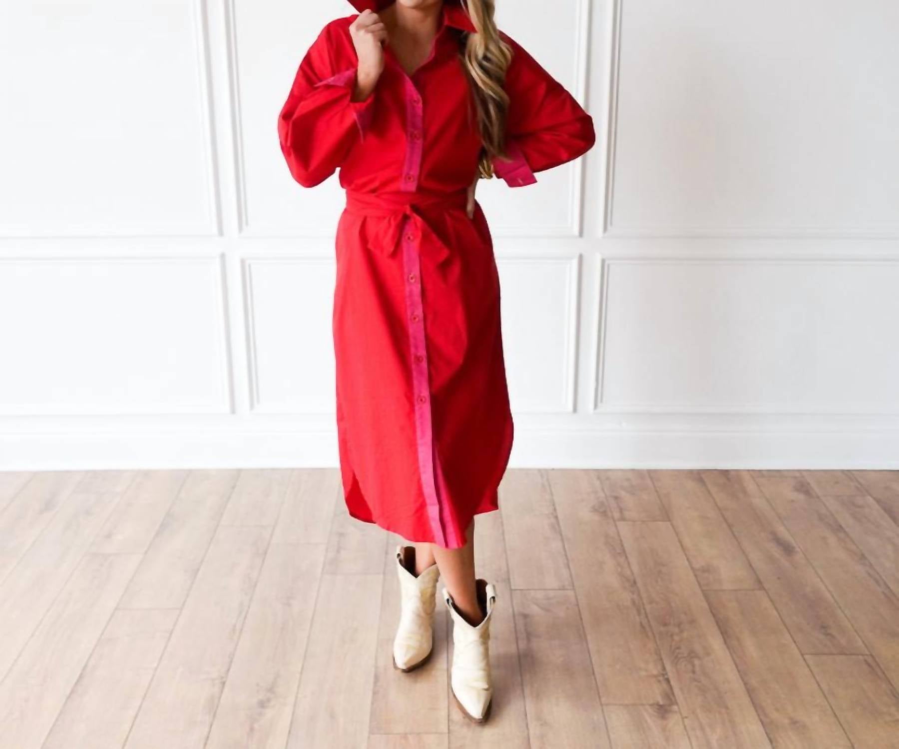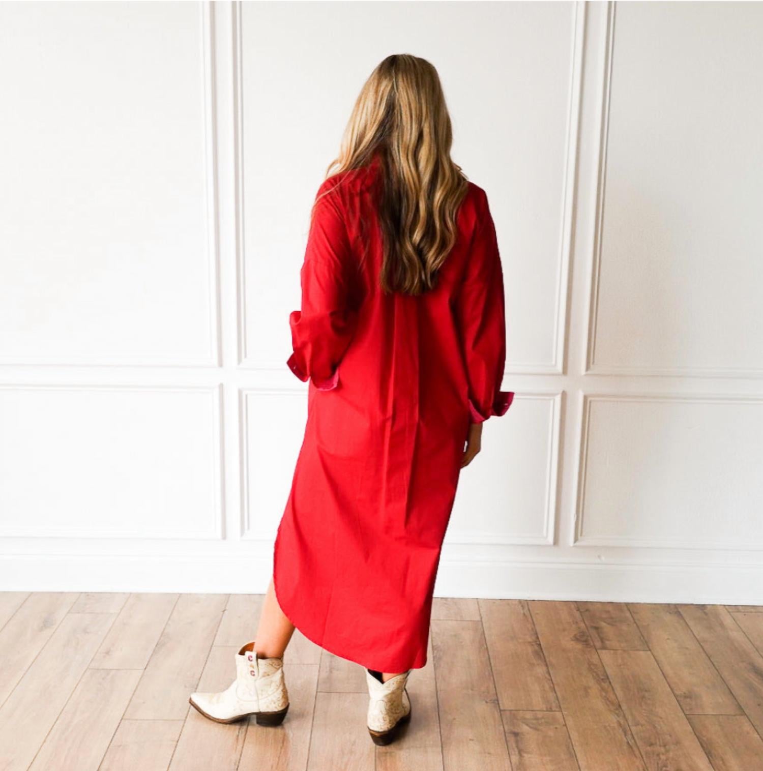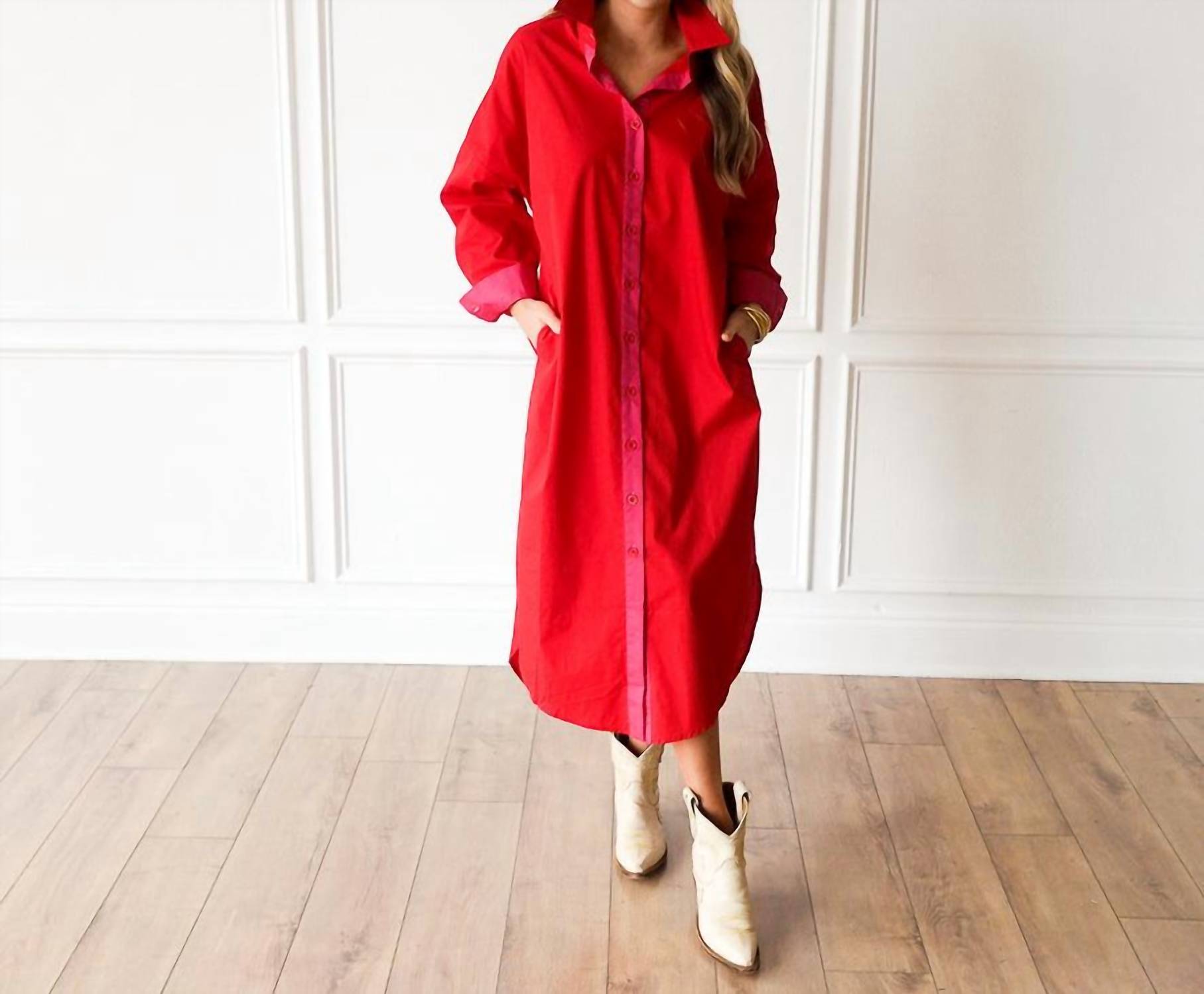 Pair with your favorite sandals for an effortlessly chic look. The Dani Dress by Caryn Lawn is the epitome of casual elegance in vibrant red with a contrasting pink placket. Designed with long sleeves and crafted from lightweight cotton poplin, this one-size-fit-most dress (sizes 8-12) offers comfort and style. Its 50-inch length, collared neckline, and button closure enhance its tailored appearance, while the detachable belt and side pockets add functional flair. Perfect for transitioning from day to evening, it's a versatile addition to your wardrobe.