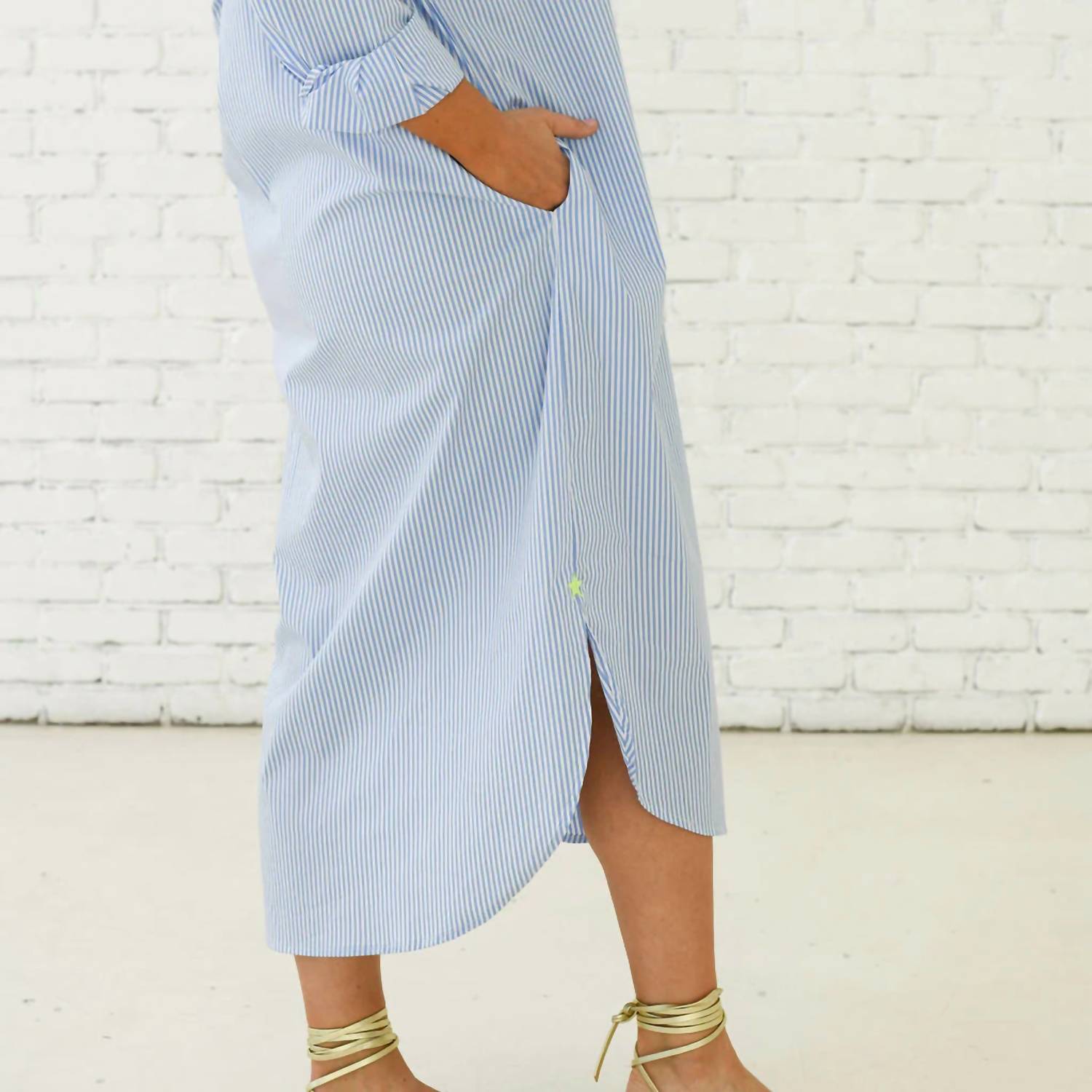 A flattering yet comfortable dress you'll be reaching for season after season. Discover effortless chic with the Piper Shirt Dress by Caryn Lawn, perfect for work or vacation occasions. This women's long sleeve dress is crafted from a soft, solid blue poplin fabric, offering a lightweight, breezy fit with a sophisticated collar and button closure for added elegance. Designed in a shirt dress silhouette with a total length of 50 inches, it features practical pockets and a playful star detail on the side. Care instructions: Dry clean only. One size fits sizes 4-12 best.
