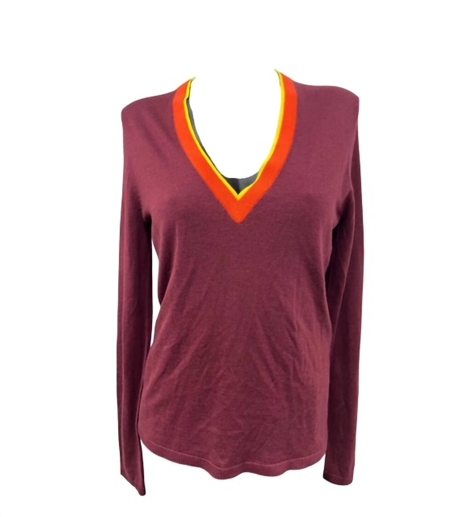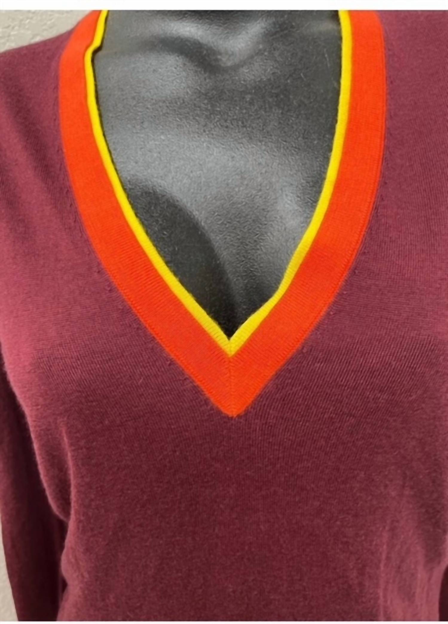 Wear this v-neck sweater with your favorite denim for the perfect fall look. Elevate your fall wardrobe with this sweater designed for modern minimalism and perfect for travel. Long-sleeve sweater features a v-neckline accented by a striking orange and yellow contrasting trim. Crafted from a luxurious blend of 70% cashmere and 30% silk, ensures both softness and elegance. Pull on style. Ideal for women seeking a slim, flattering silhouette that layers effortlessly.