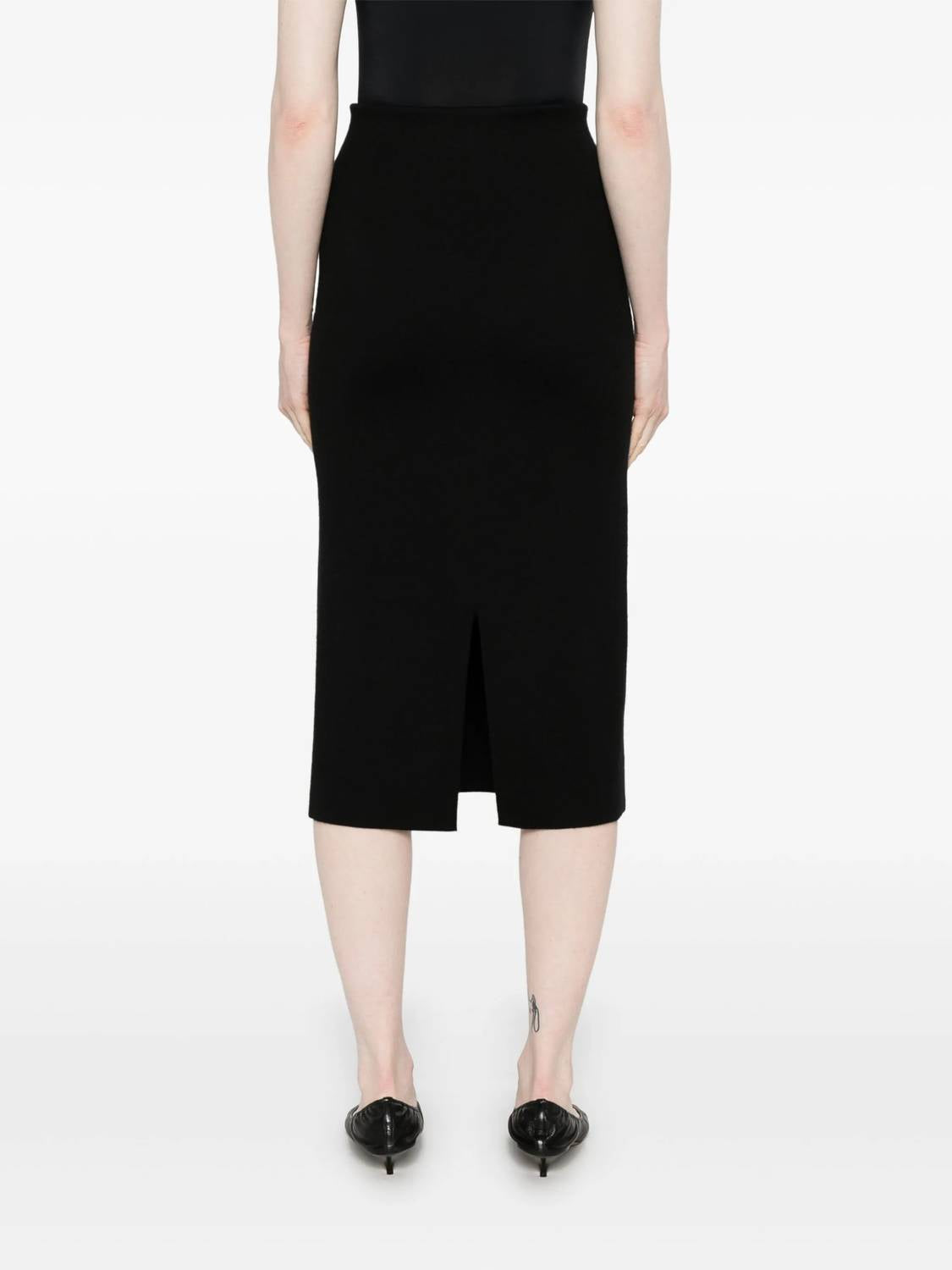 Show off just the right amount of skin in this beautifuly designed midi length skirt. Discover the Ikko Skirt by The Row, an exemplar of sophisticated simplicity in solid black. Crafted from 100% Cashmere, this exquisite midi skirt is designed with an elasticated waistband for comfort and a sleek rear slit for ease of movement. Originating from Italy, it features a straight hem and a convenient pull-on closure. To maintain its luxurious feel, hand wash only.