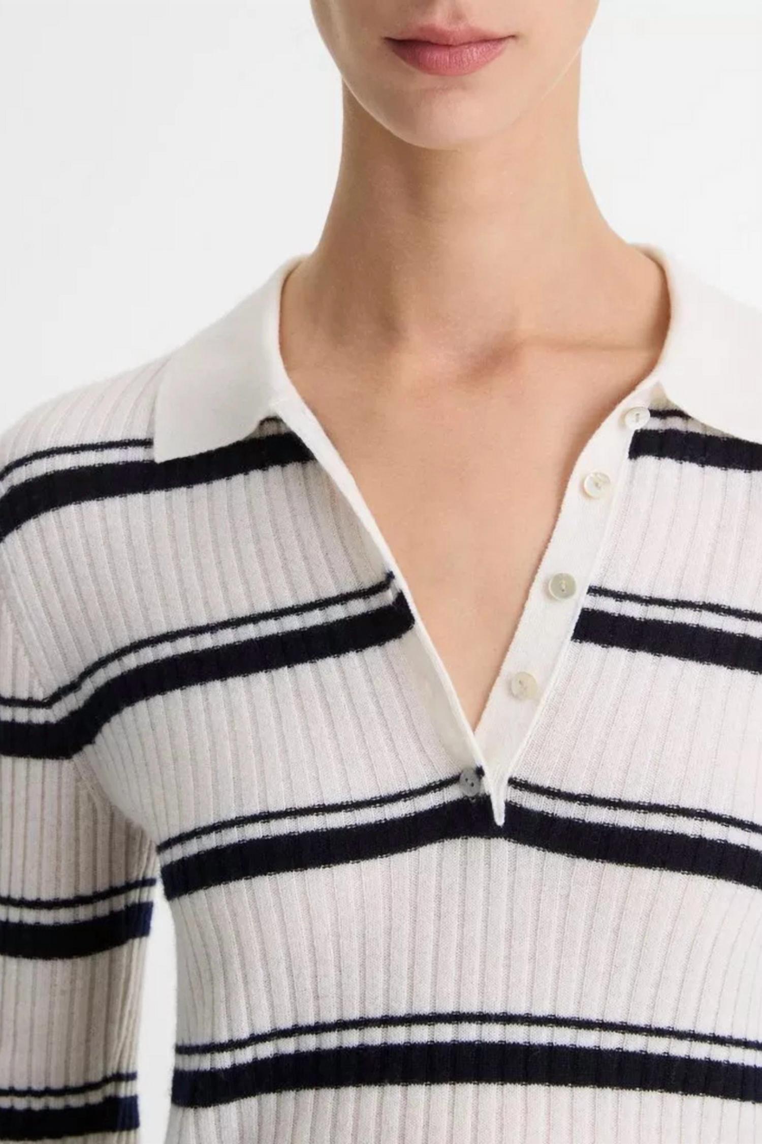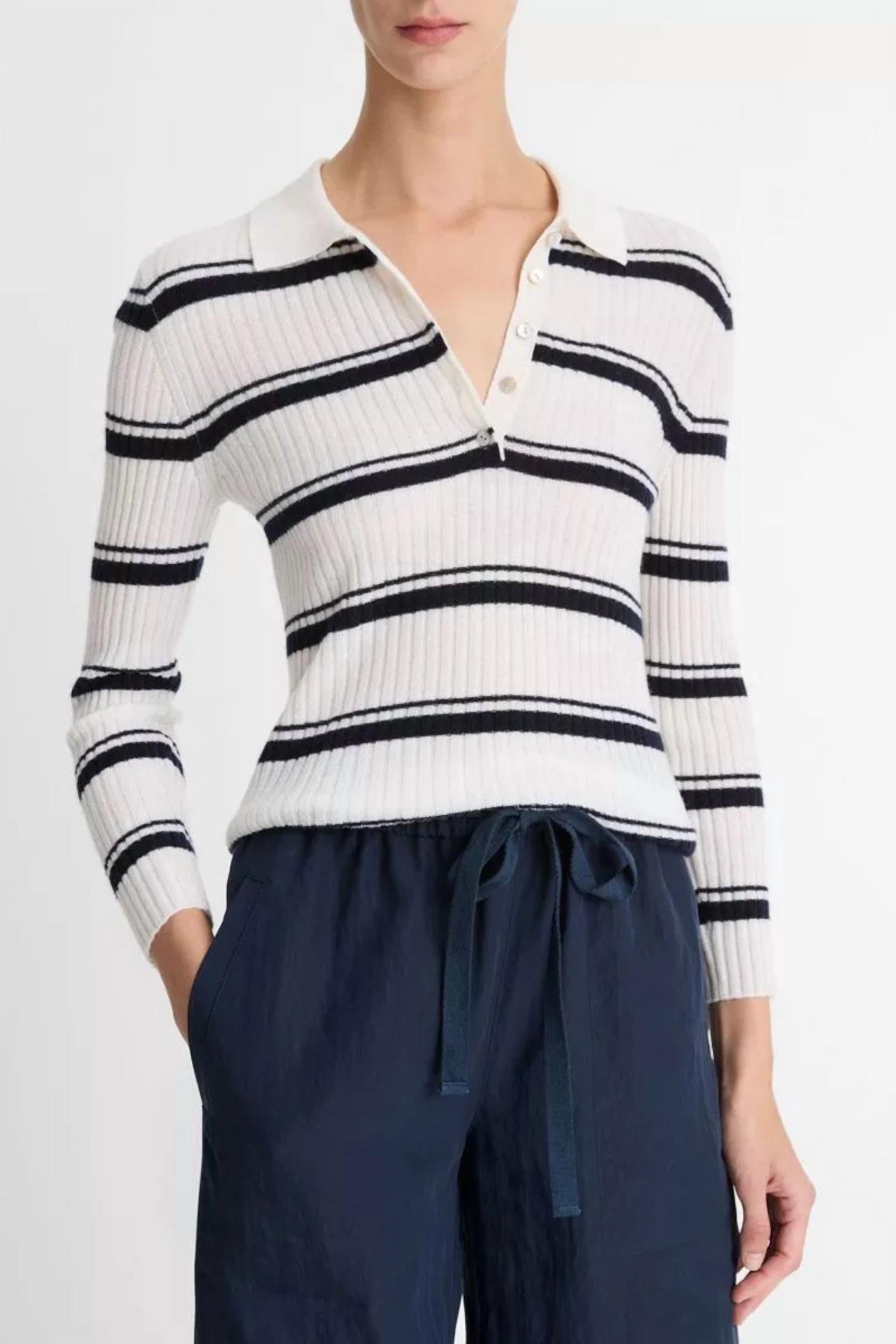 Stay warm and stylish in this versatile and effortlessly cool knitwear staple. Wear it alone or layered, it's the perfect sweater for the season and you'll wish you had it in every color. Experience luxurious comfort with the Vince Silk Blend Stripe Polo Sweater, an elegant addition to your spring wardrobe. This long sleeve sweater combines a ribbed blend of 85% cashmere, 13% silk, 1% nylon, and 1% spandex, offering a soft hand feel and a beautiful drape. Designed in a classic white and black stripe pattern, it features a five-button closure for a polished look. Care: Dry clean only. Ideal for workwear or a concert occasion.