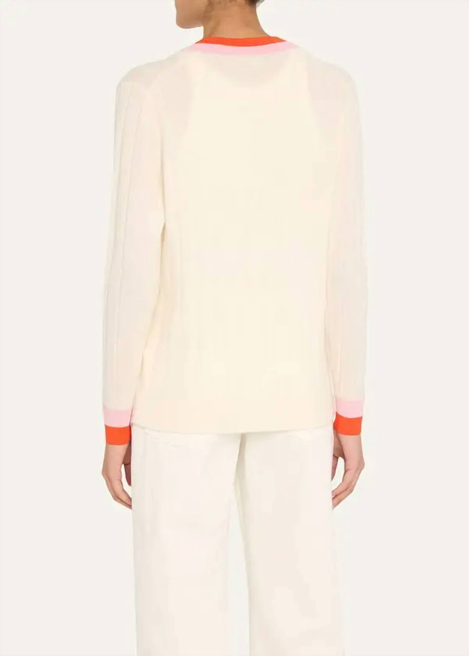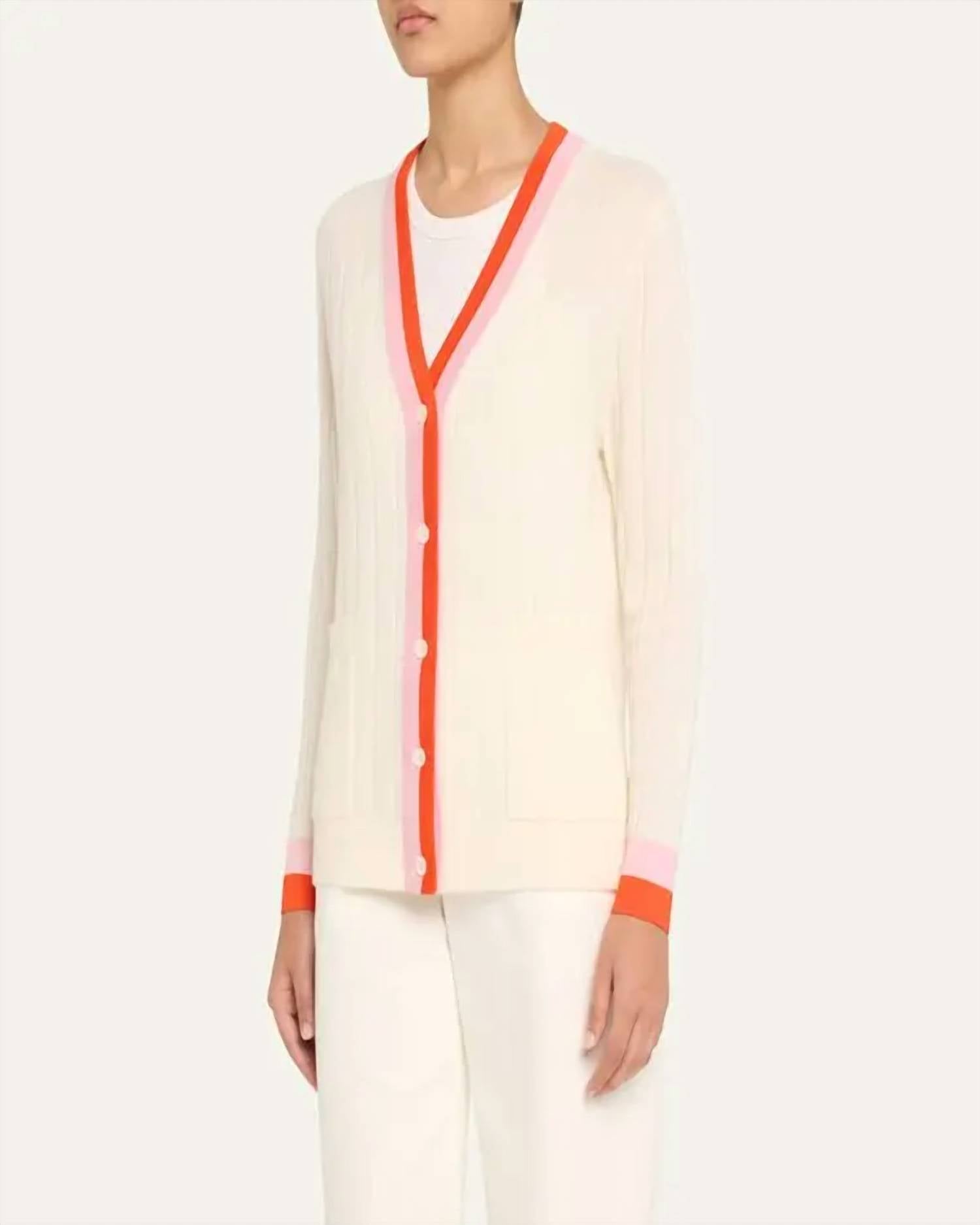 This cardigan will be a sweater-rotation favorite. Experience the luxury of the Sinclair Sweater by KULE, crafted entirely from premium cashmere for ultimate softness. This long sleeve cardigan showcases a textured pattern in a striking Cream/Poppy/Pink colorway, perfect for adding a pop of color to your fall wardrobe. Designed with a V-neck and button closure, it features convenient pockets for functionality. Care: Hand wash.