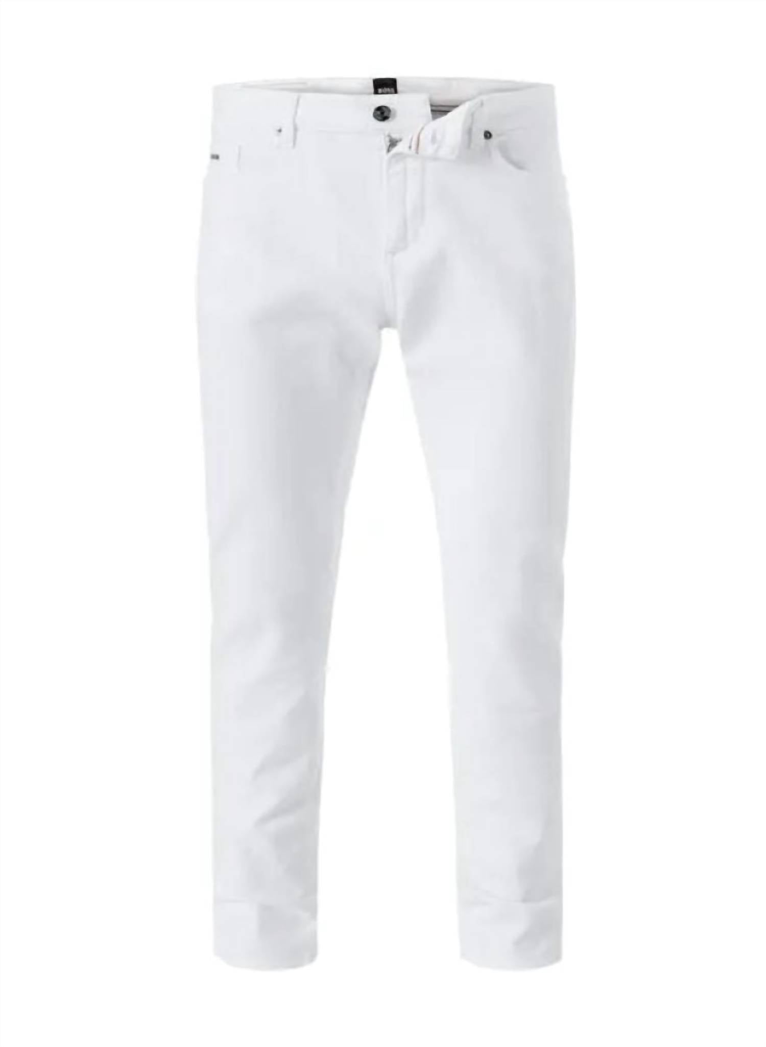 Elevate your casual wardrobe with the Hugo Boss Men's Cotton Denim Jeans in solid white, offering a cashmere-like touch for unbeatable comfort. Crafted from a blend of 92% cotton, with added elasticity for a perfect slim fit, these jeans feature a mid-rise waist and straight leg for a timeless look. Designed with practical side pockets and a drawstring closure, these jeans are ideal for both style and convenience. Care is simple with machine wash instructions, making these light wash jeans a streetwear staple this summer and a perfect choice for festive occasions like a 4th of July holiday party.