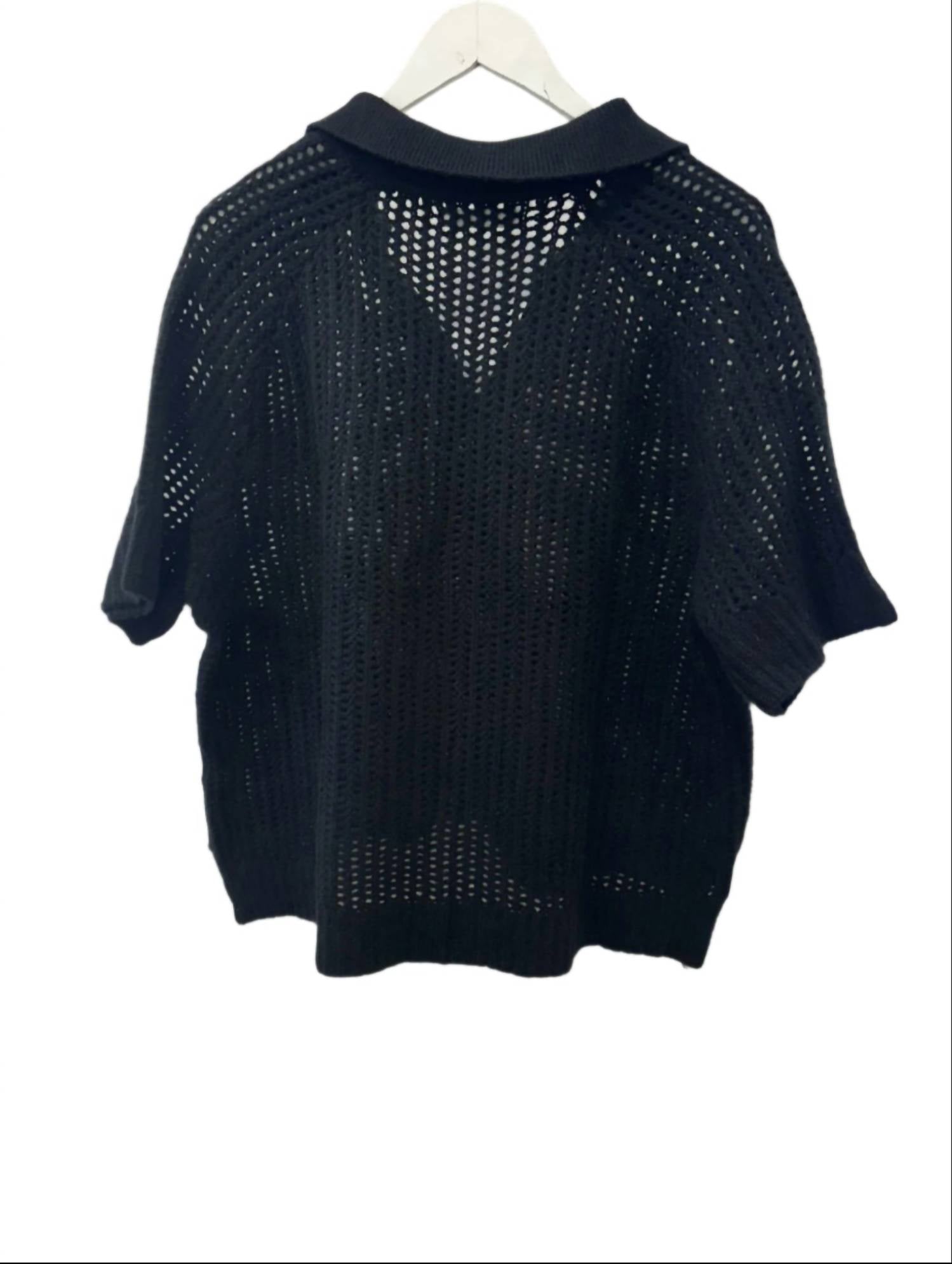 Introducing the Shalom Relaxed Split Neck Polo Lounger Tee by SABLYN, a minimalist masterpiece for your summer wardrobe. This black tee features short sleeves and a V-neckline with a split detail, all in a luxurious open-knit texture. Crafted from 100% cashmere, it effortlessly combines comfort and style, with a ribbed bottom hem and cuffs for added elegance. Closure: Pull-on. Care: Hand wash only. Tailored for weddings and refined gatherings, this lounger tee is an indulgence in sophisticated casualwear.