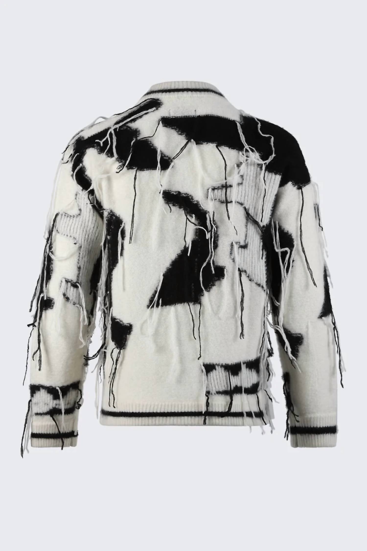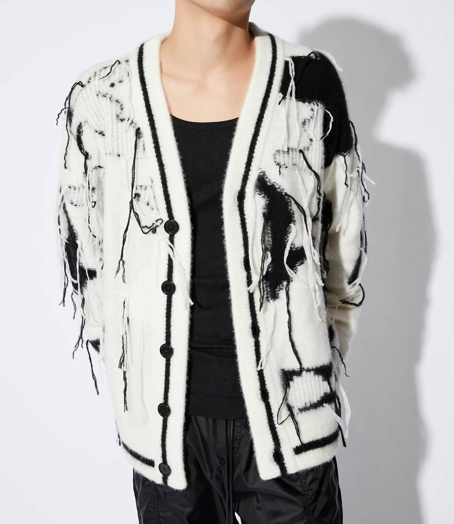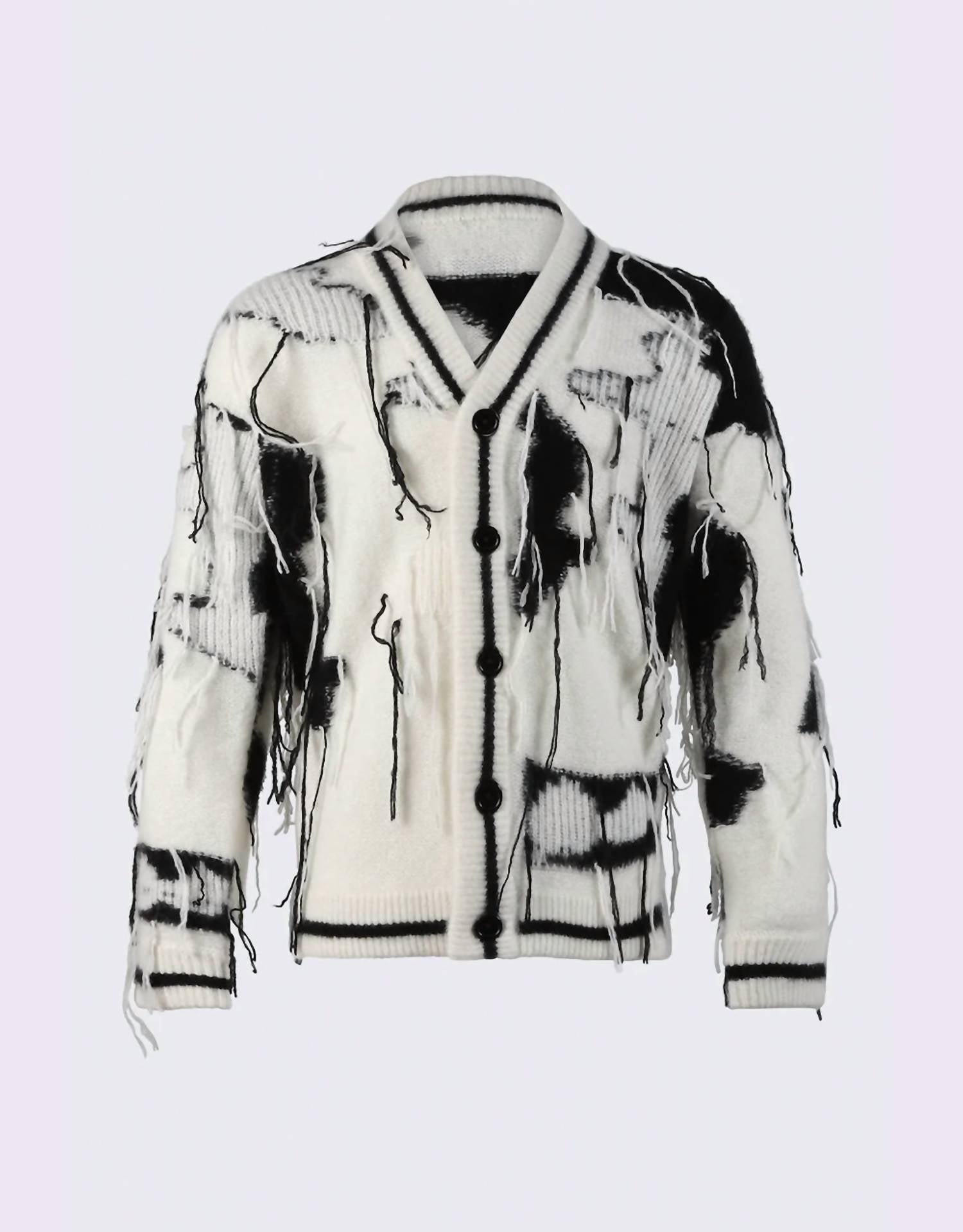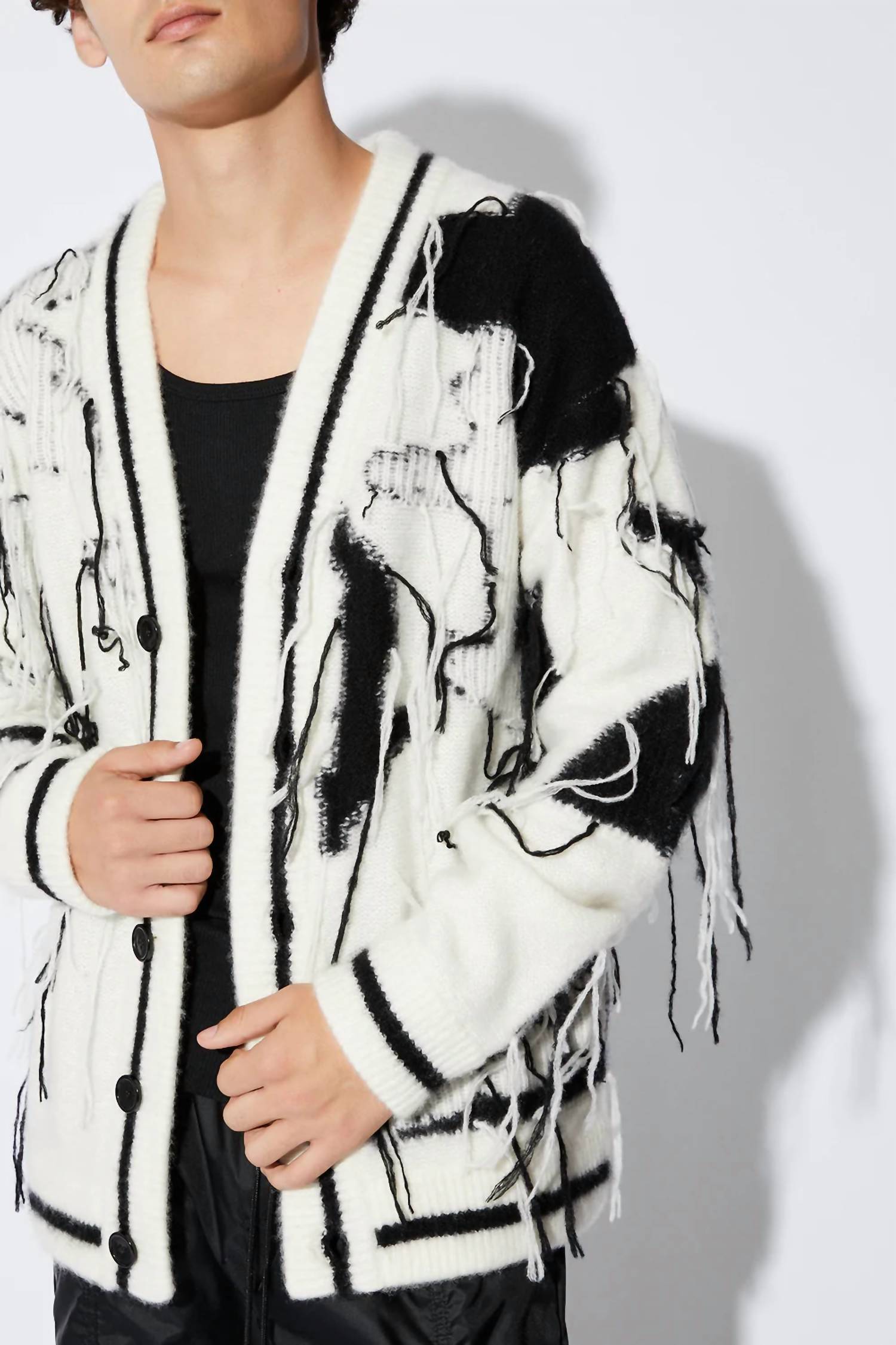 Introducing the Zephyr Sweater by RtA, a refined black abstract cardigan perfect for spring travels. This men's patterned cardigan, crafted from a luxurious 75% Cashmere and 25% Silk blend, features long sleeves and a sophisticated V-neckline. It is designed with a button closure and boasts an oversized fit, offering both comfort and style. Made in the PRC, this piece requires dry cleaning to maintain its quality. Model is 6'2" and wears a size S.